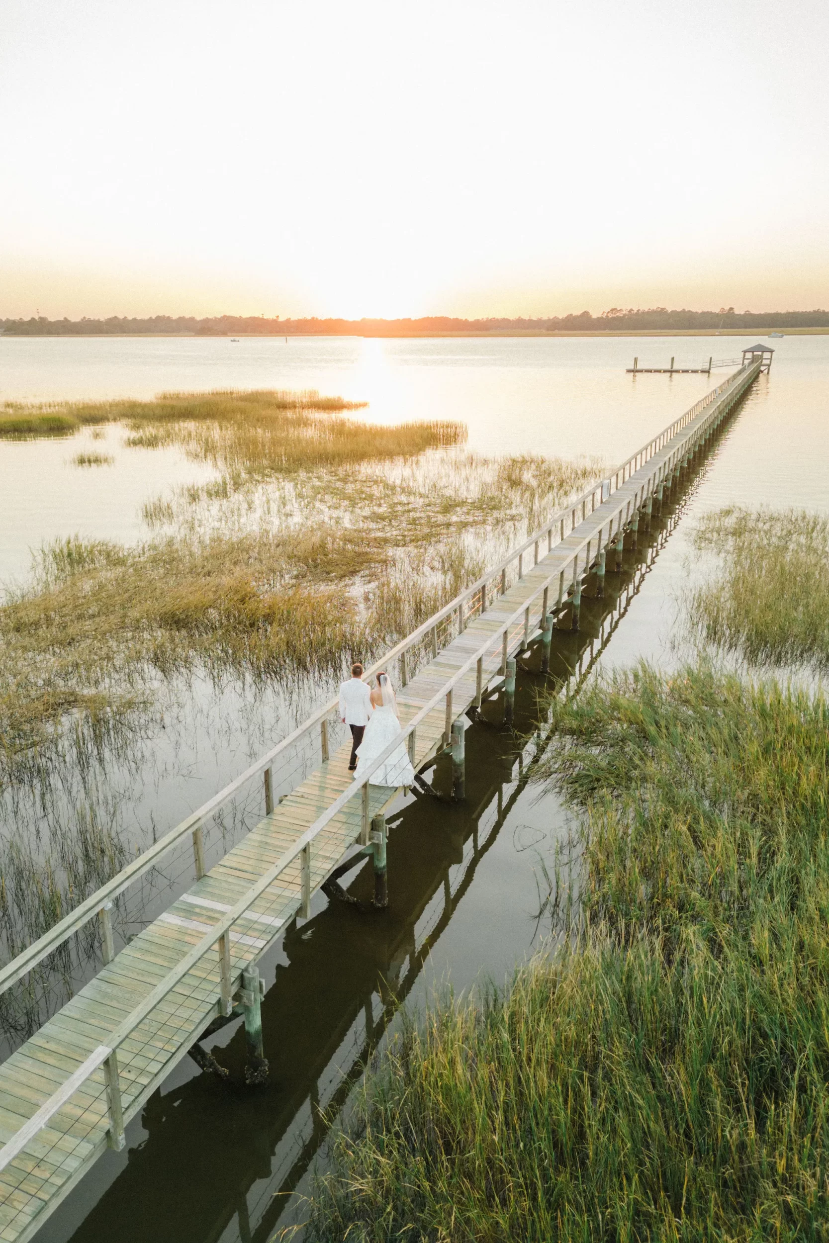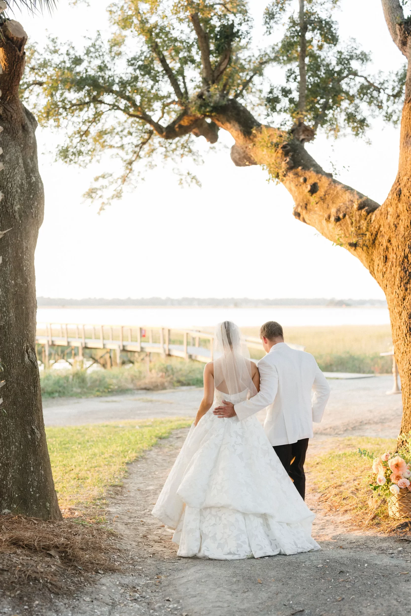 After the ceremony, we snuck away with Maggie & Evan for some golden hour dock portraits. The view at sunset at Lowndes Grove is unreal, so it’s always a must do! The way the sun sets right over the dock gets us every time!!