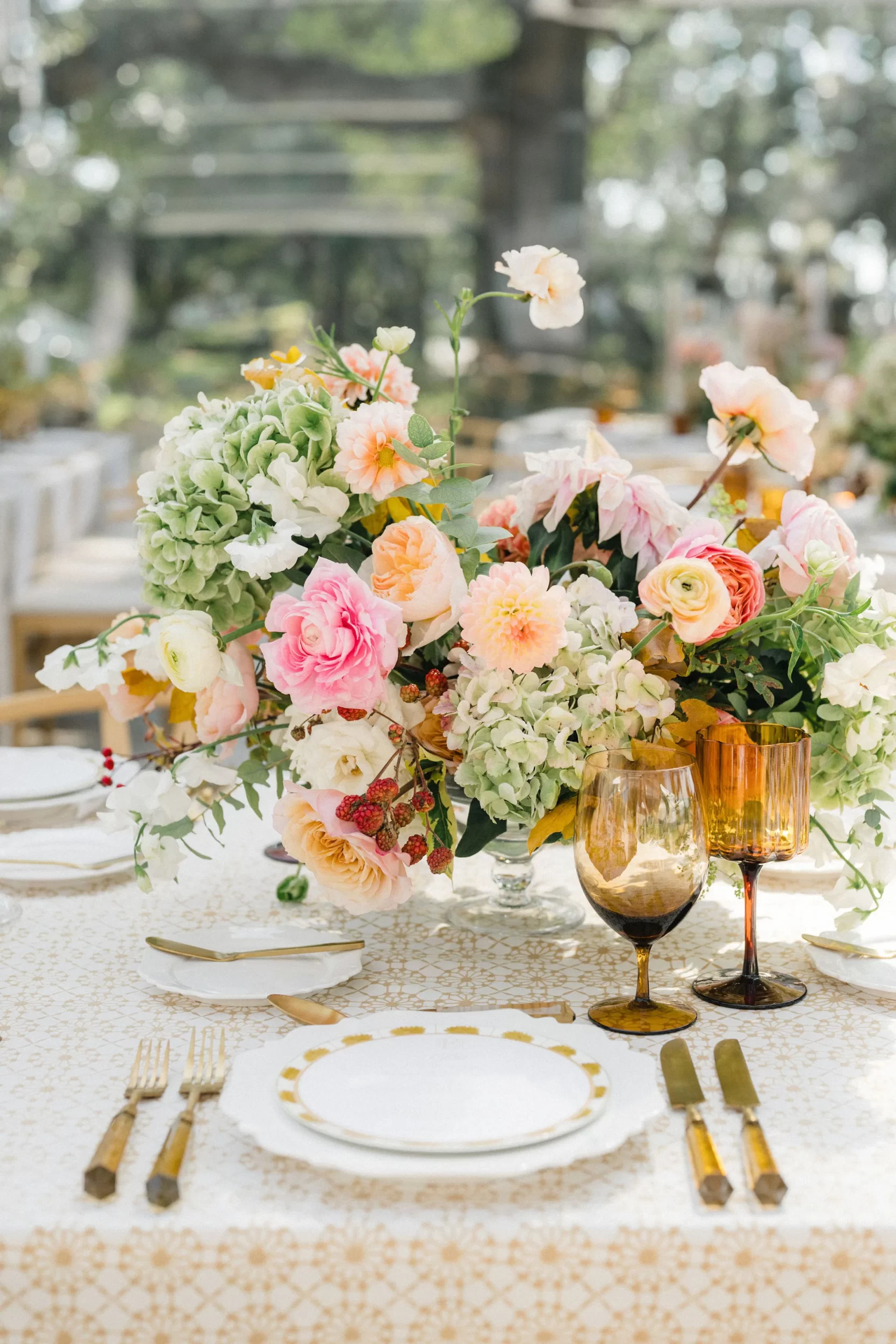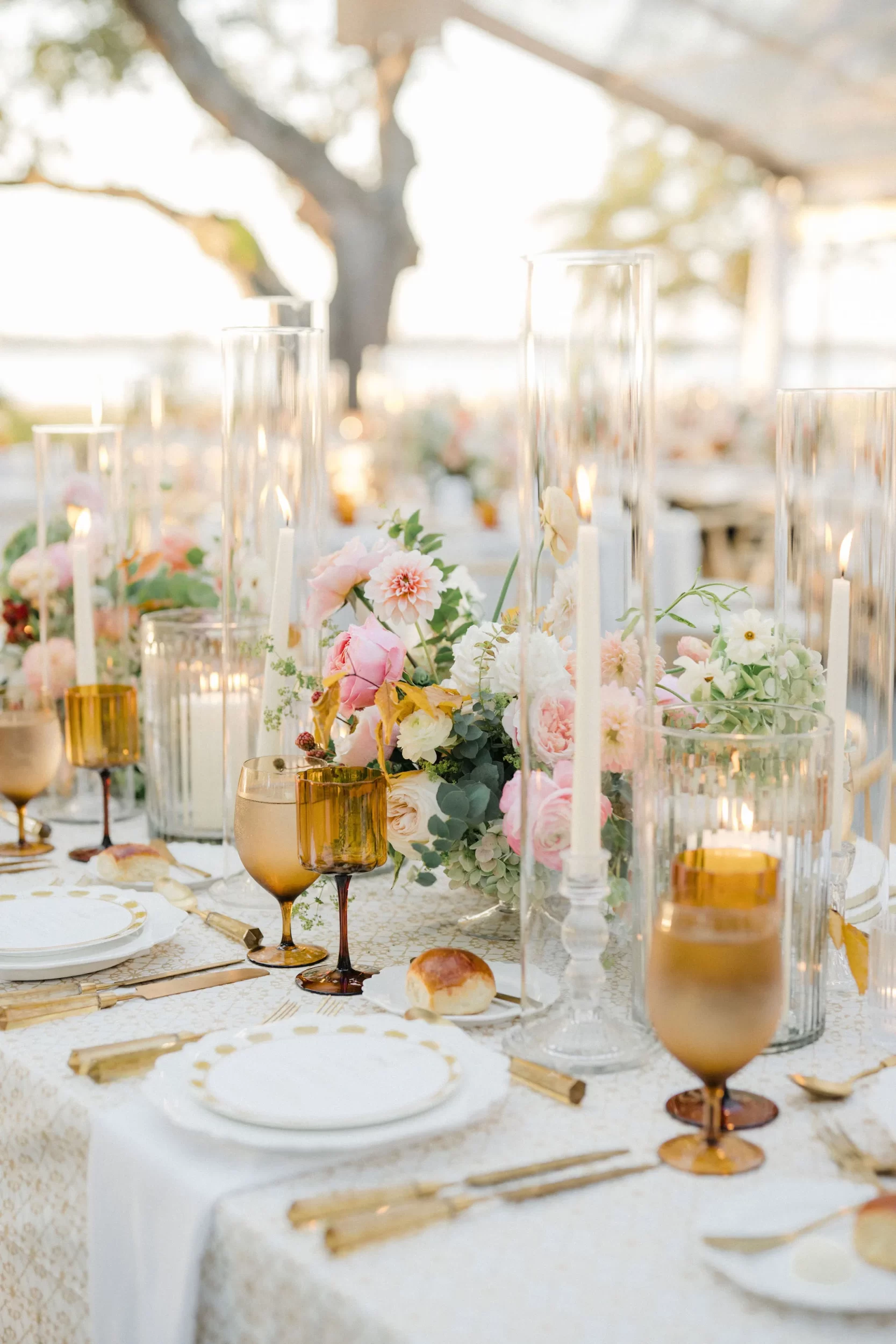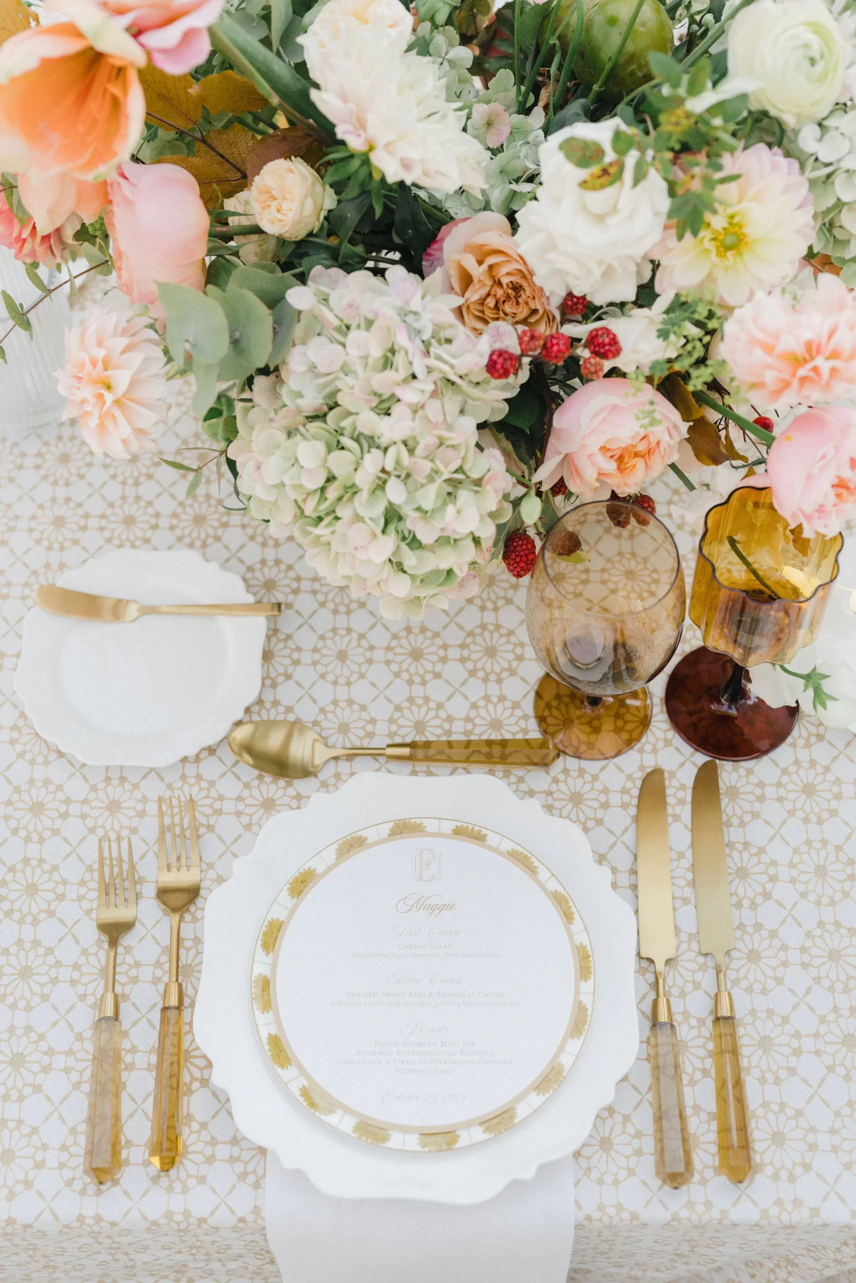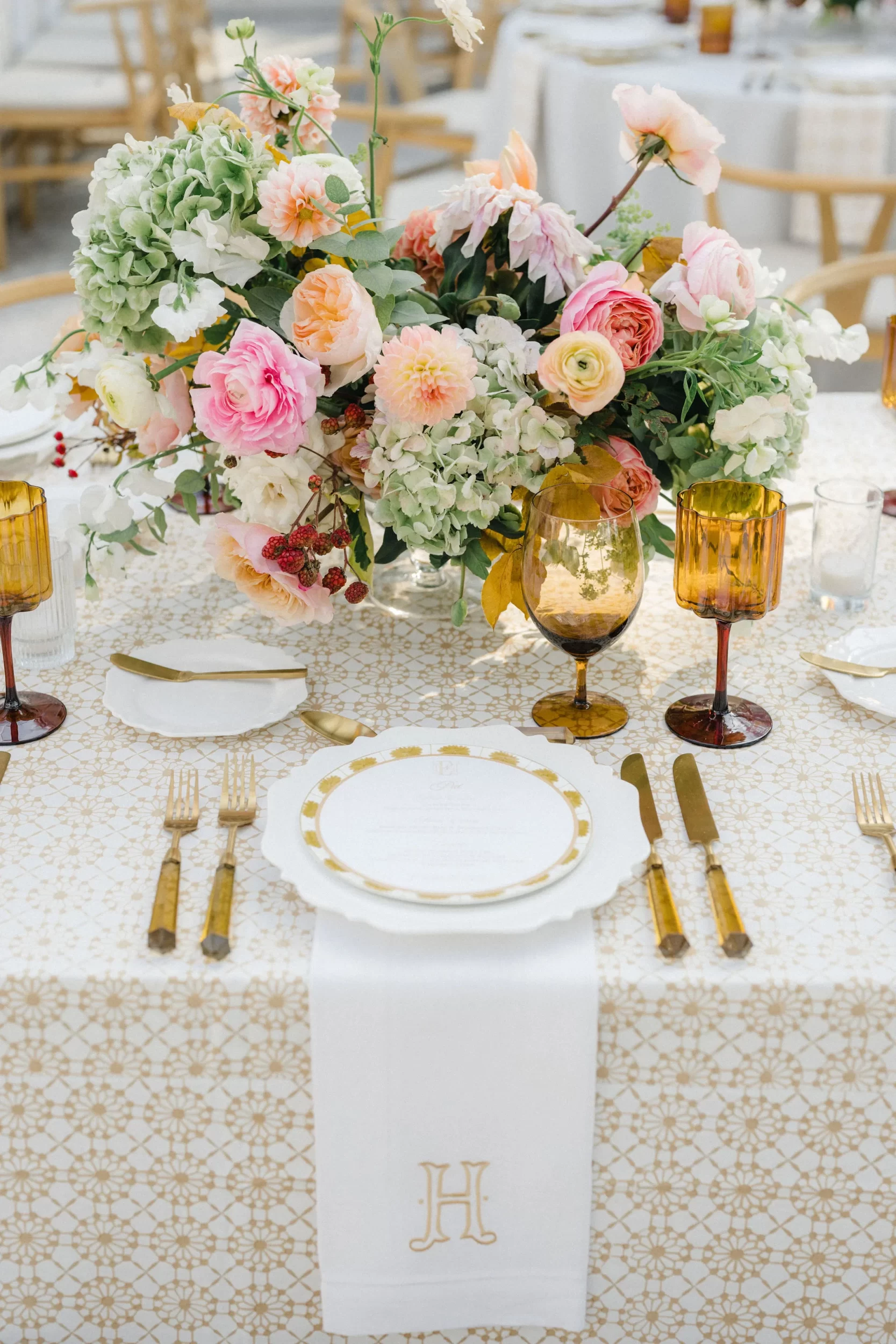 The reception was bursting with color and energy!! … A perfect reflection of Maggie & Evan! Long tables were draped with elegant linens, bold florals, and glowing candlelight. Guests danced under the open sky, laughed over champagne toasts, and soaked up every second of the night!