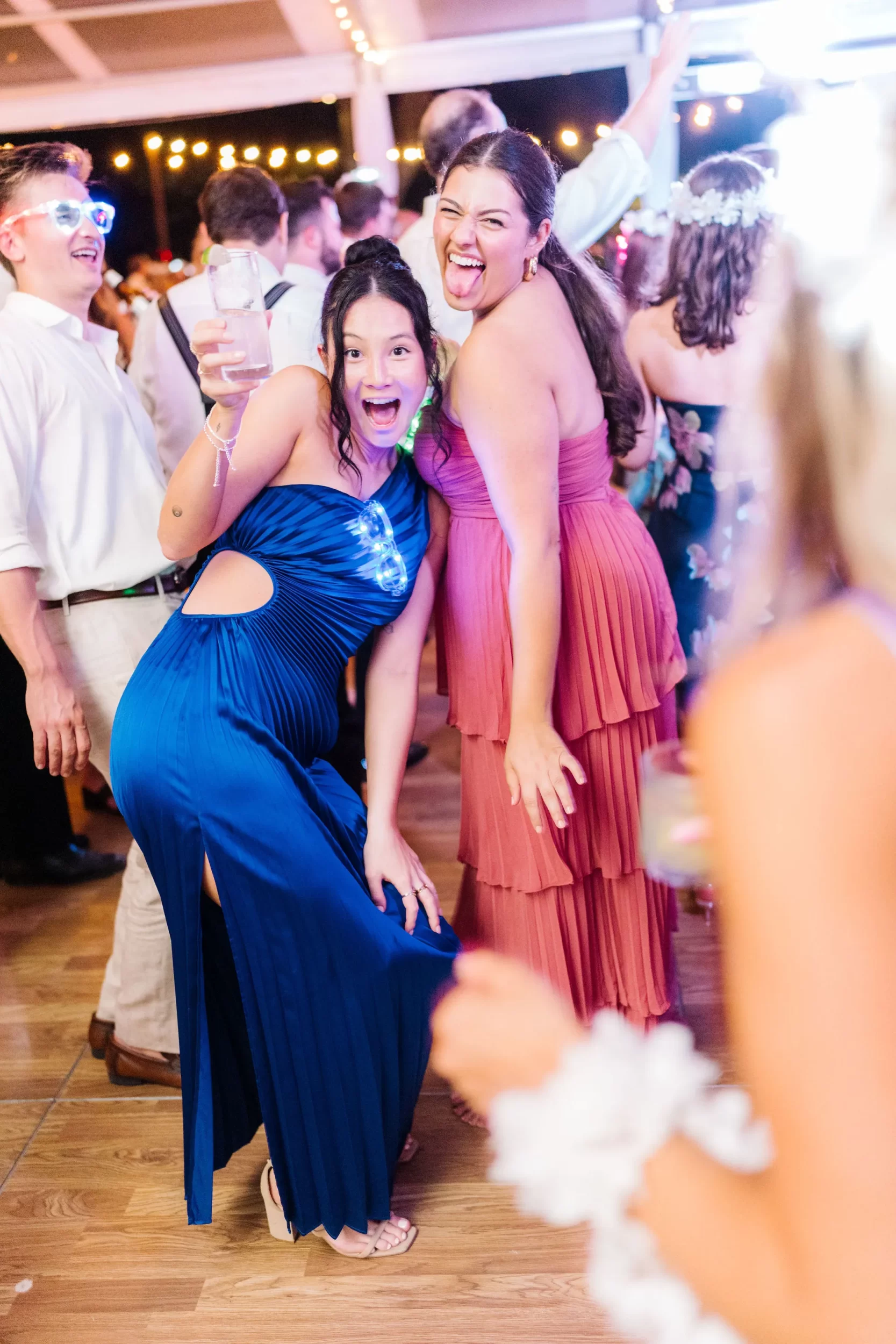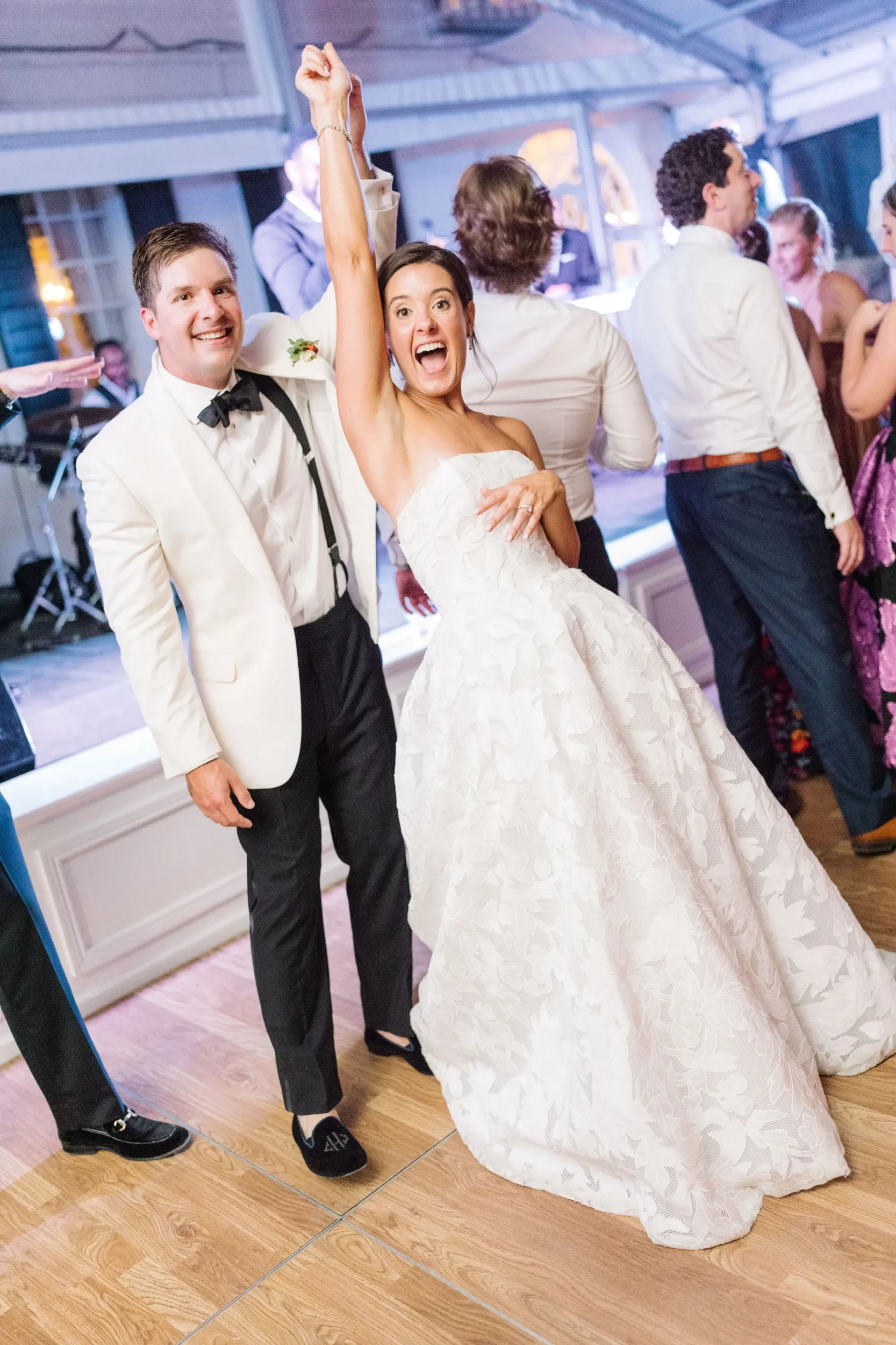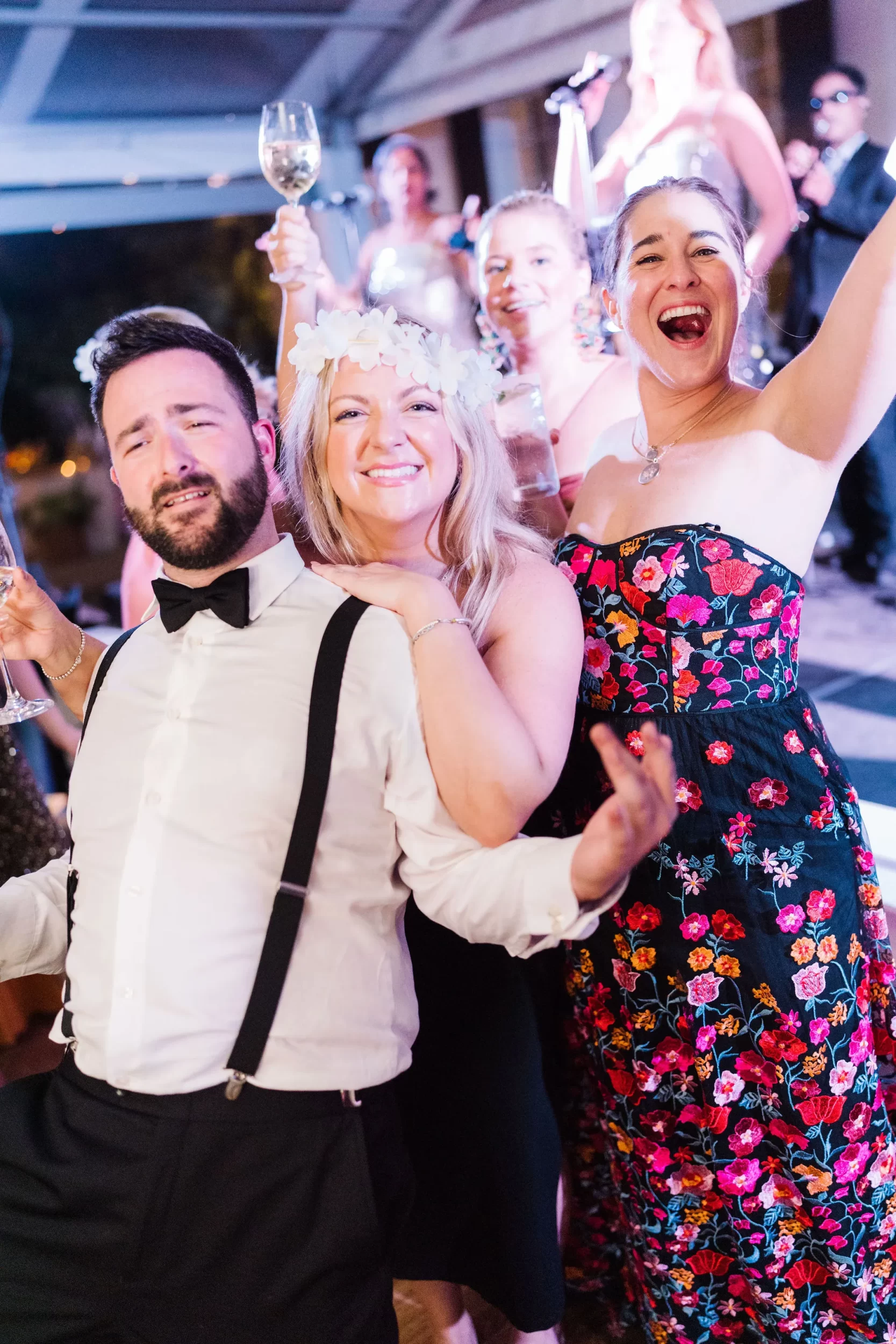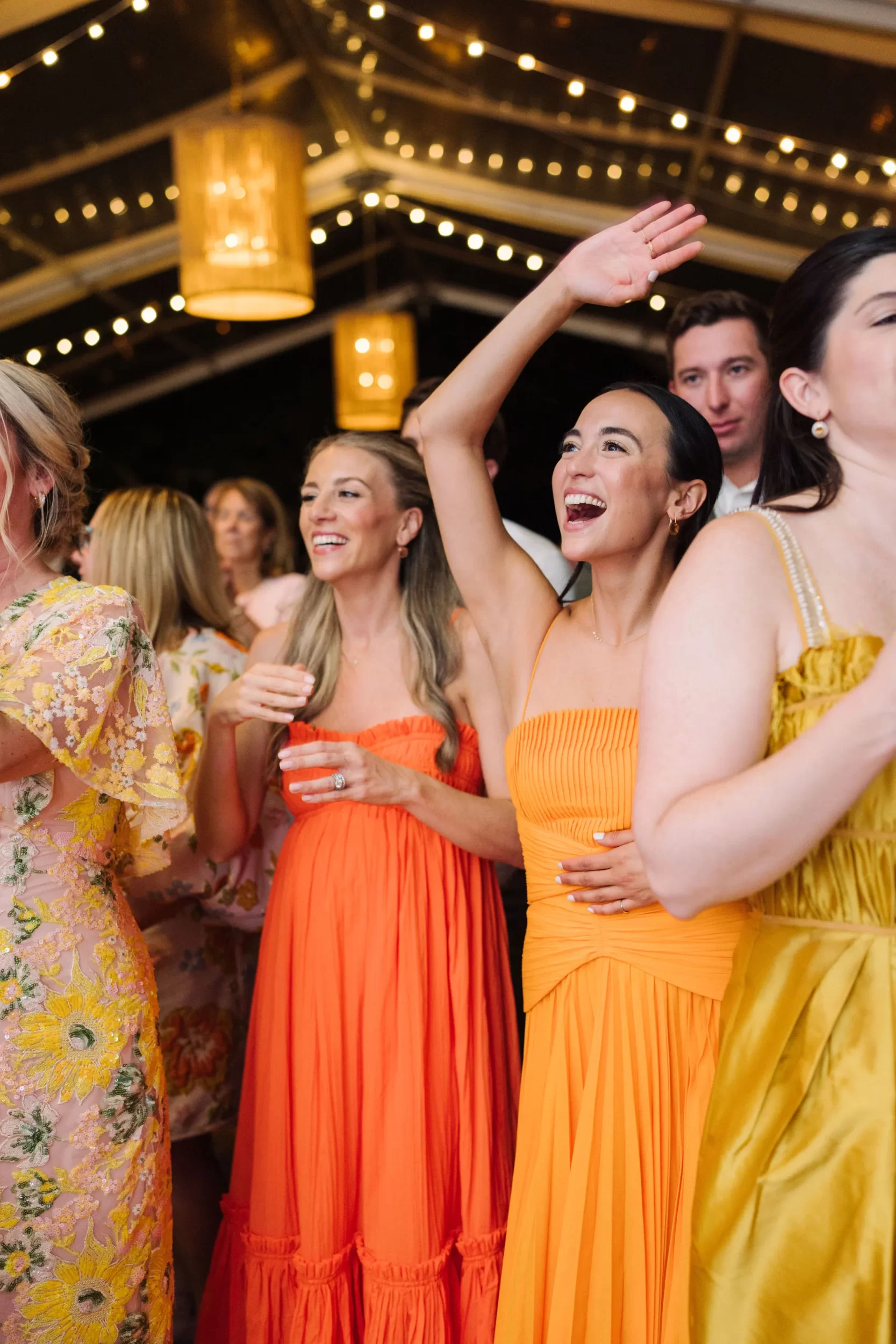 The reception was bursting with color and energy!! … A perfect reflection of Maggie & Evan! Long tables were draped with elegant linens, bold florals, and glowing candlelight. Guests danced under the open sky, laughed over champagne toasts, and soaked up every second of the night!
