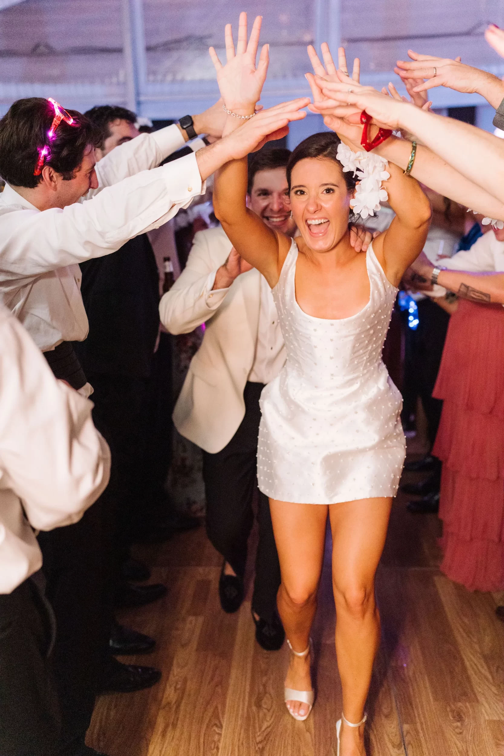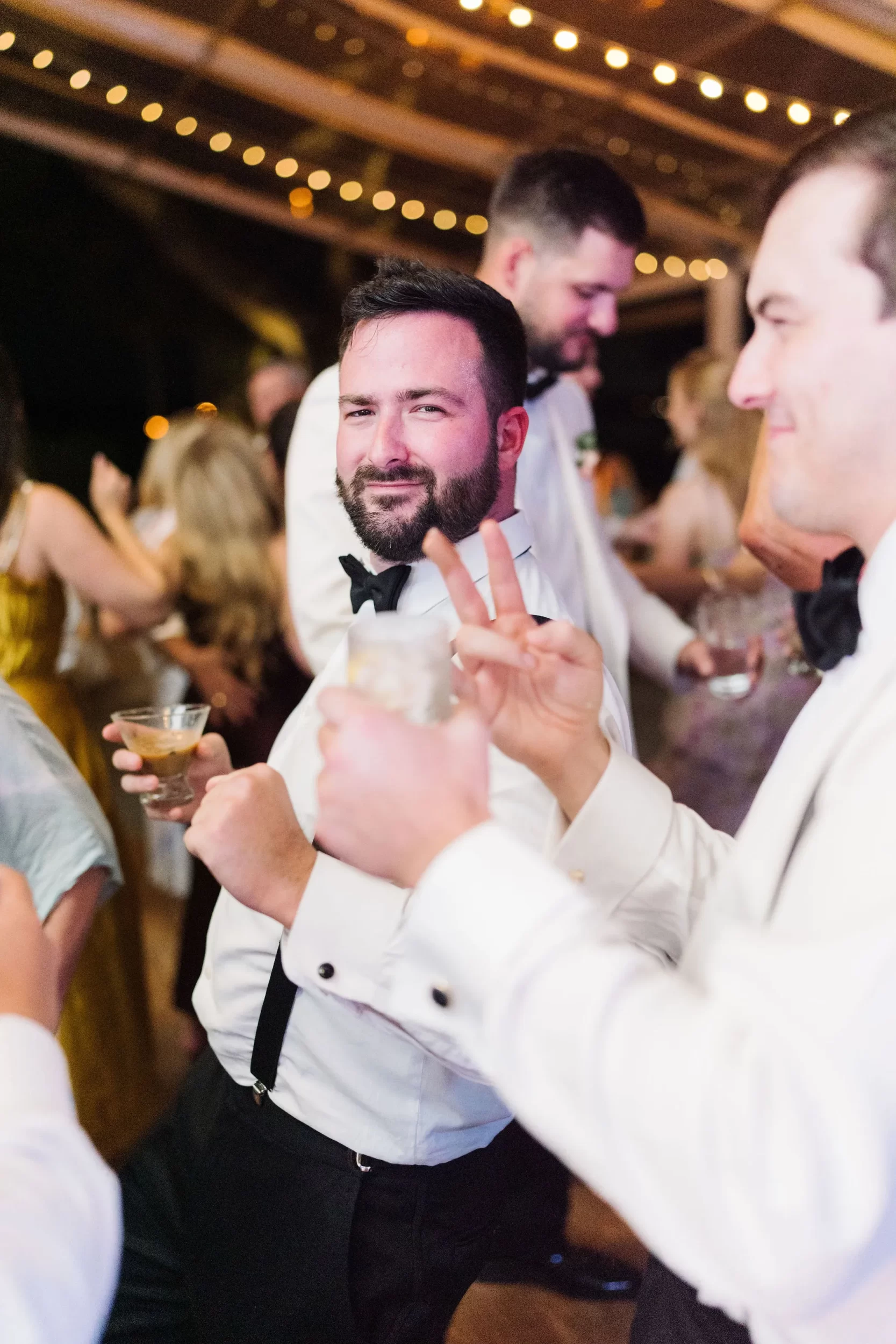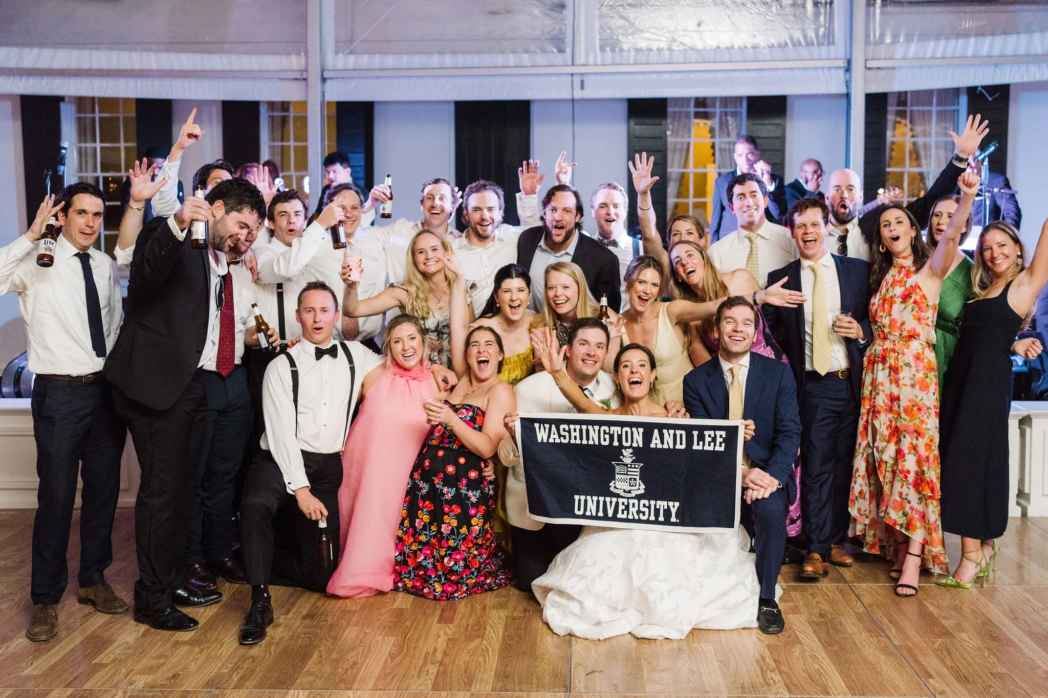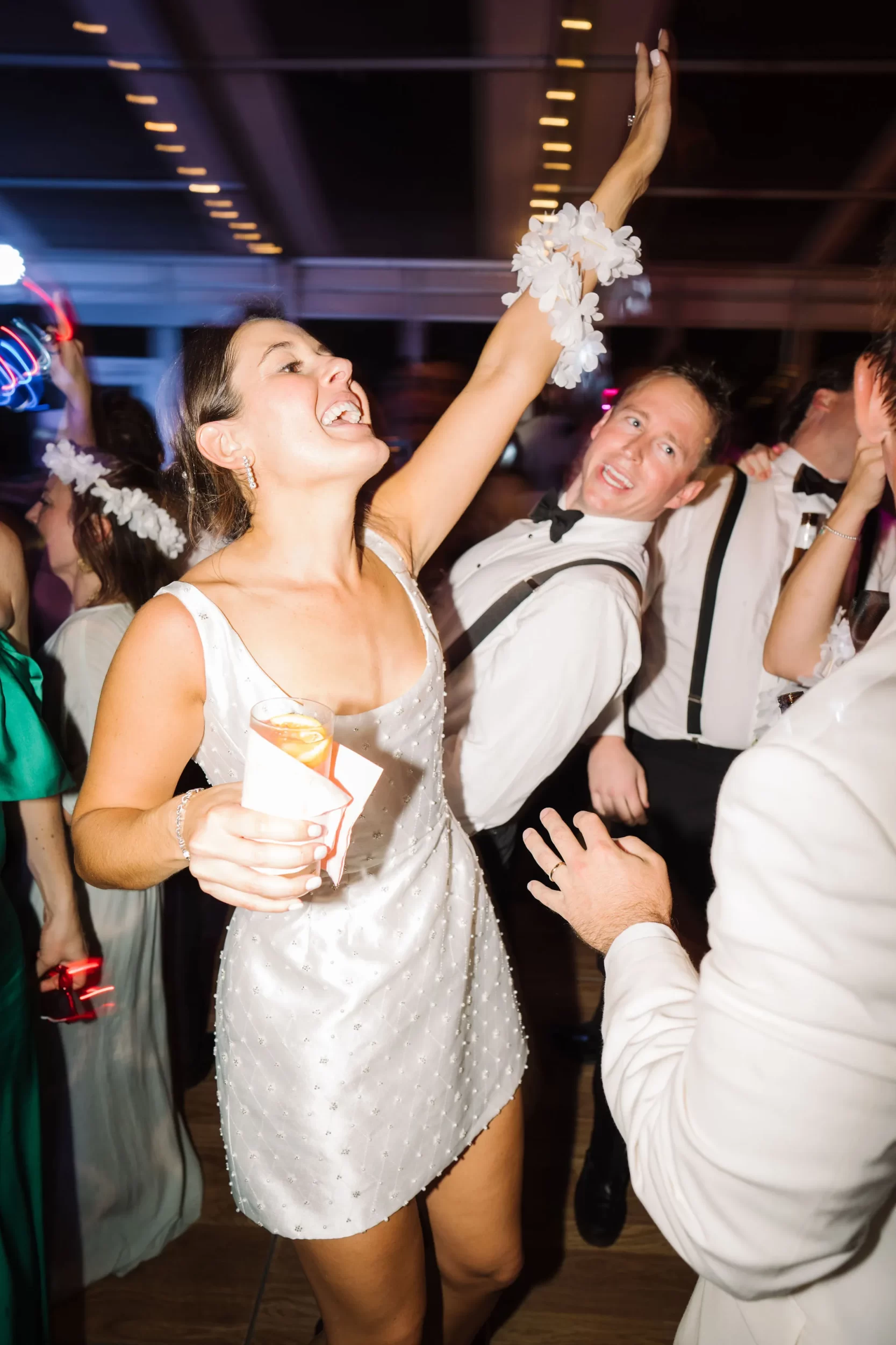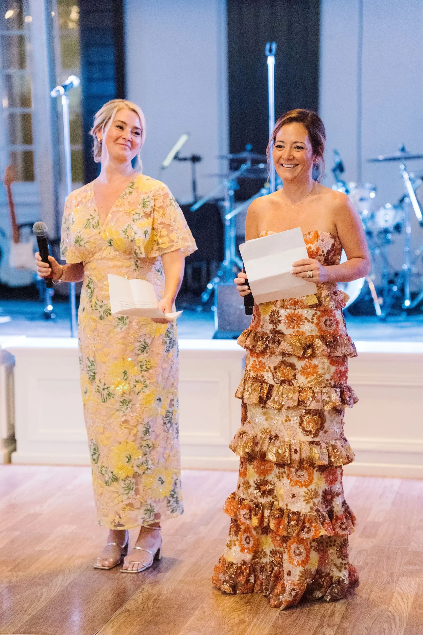 The reception was bursting with color and energy!! … A perfect reflection of Maggie & Evan! Long tables were draped with elegant linens, bold florals, and glowing candlelight. Guests danced under the open sky, laughed over champagne toasts, and soaked up every second of the night!