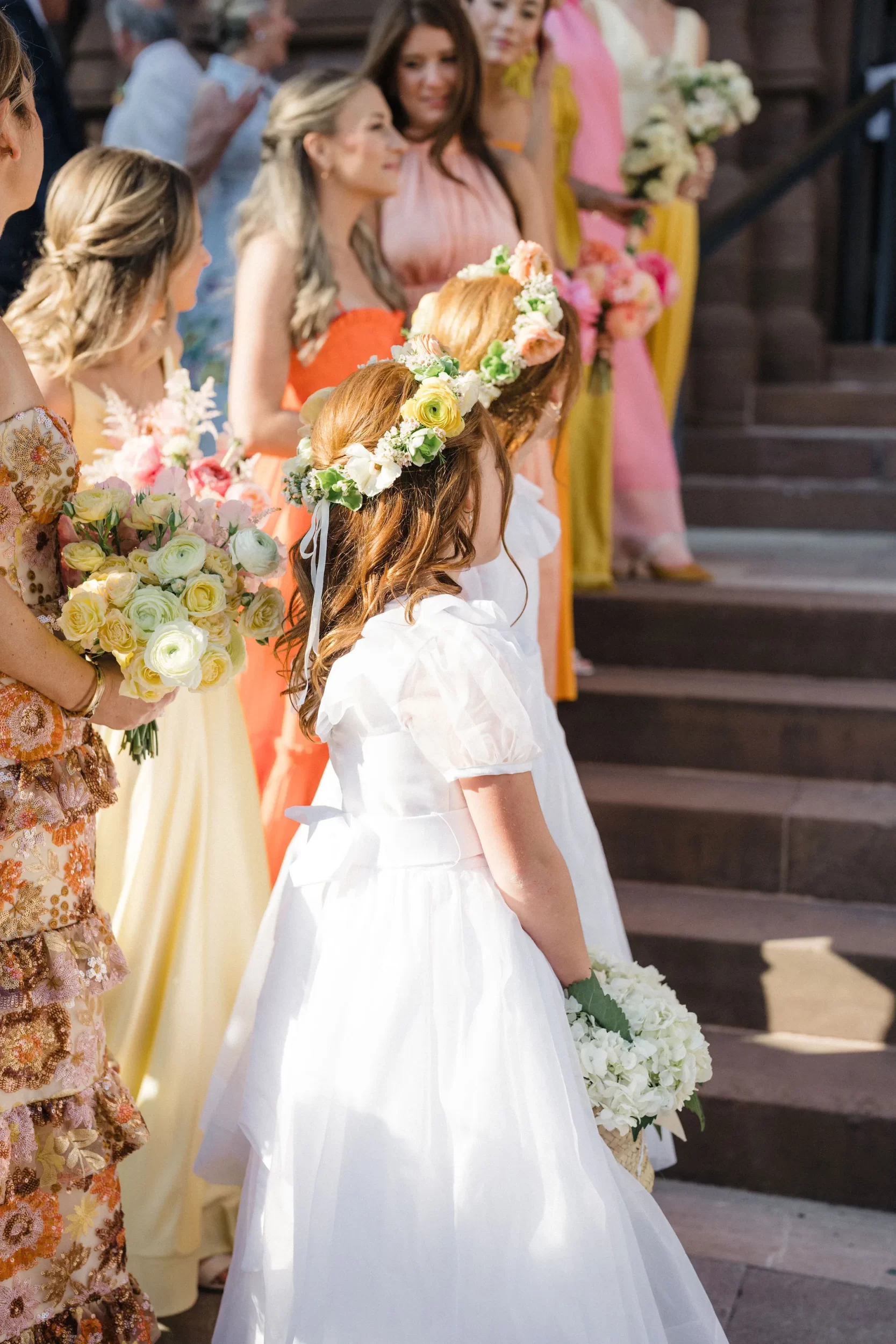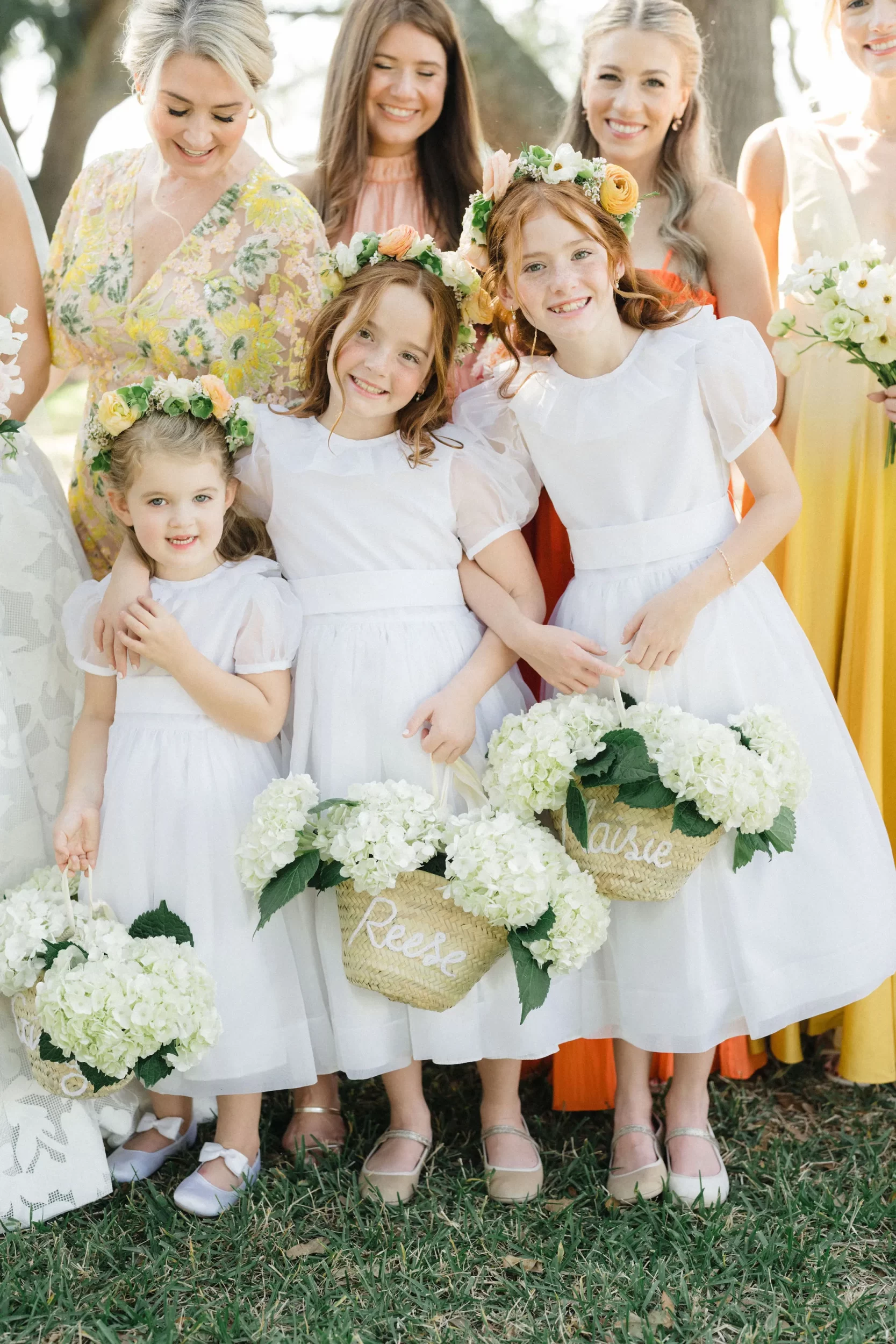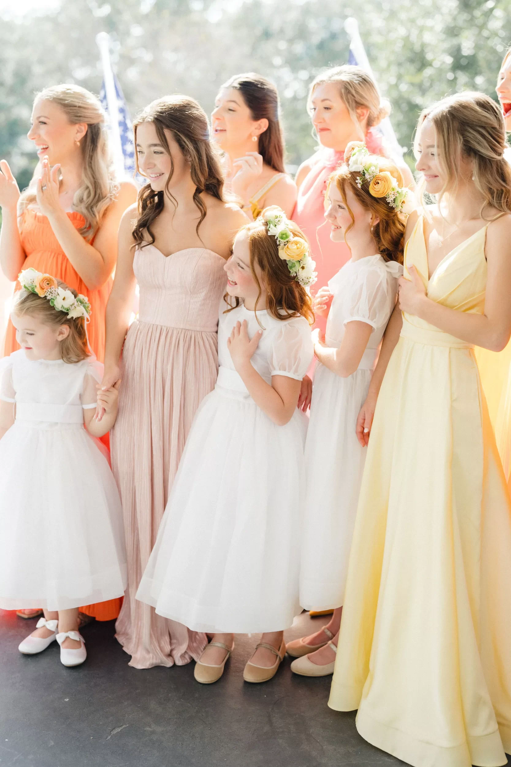 From the moment we arrived, the energy was contagious! Maggie got ready in the beautiful upstairs bridal suite, surrounded by her 8 bridesmaids and 2 jr bridesmaids and the prettiest natural light! Her bouquet — bursting with rich, colorful florals, set the tone for the whole day: timeless with a twist! And Evan? Cool as ever, hanging out under the oaks with his groomsmen before their ceremony.