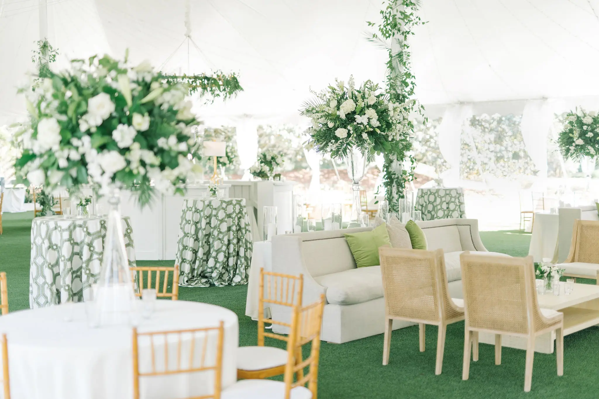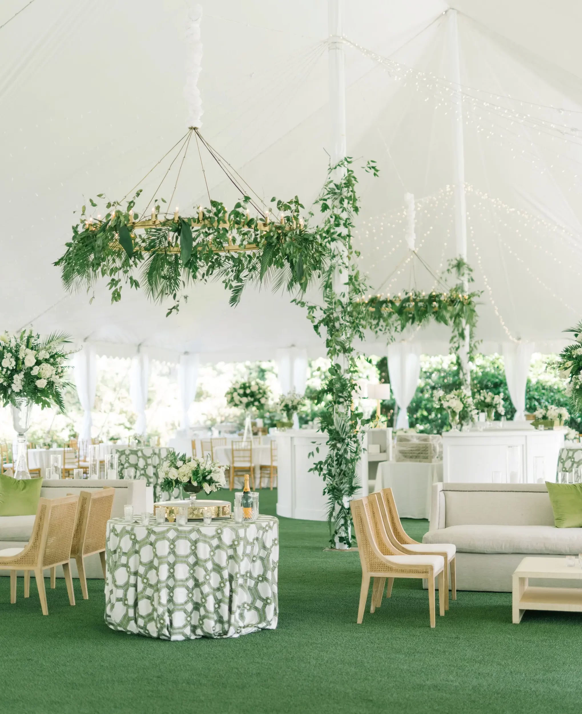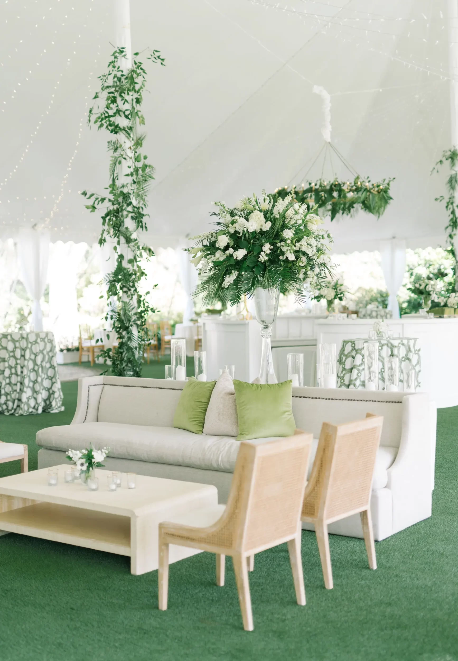 Blythe from Hill & Co worked her signature magic as their wedding planner and designer, creating a soft, romantic look filled with lush greens, clean whites, and subtle touches of gold. The tented reception space was overflowing with greenery — from hanging installations to fresh garlands — making it feel like a garden party in the best way! The white and green lounge setup by Beachview added a cozy touch, perfect for guests to relax and soak in the celebration.