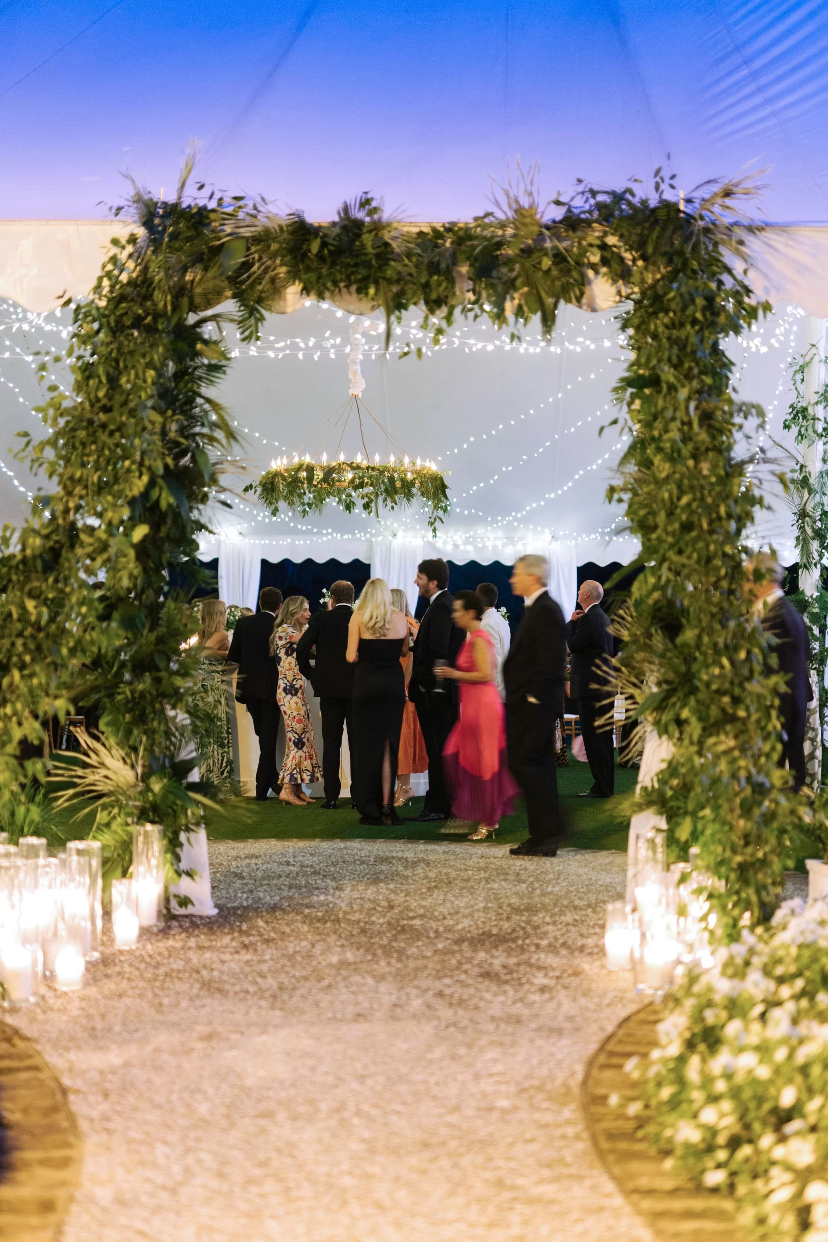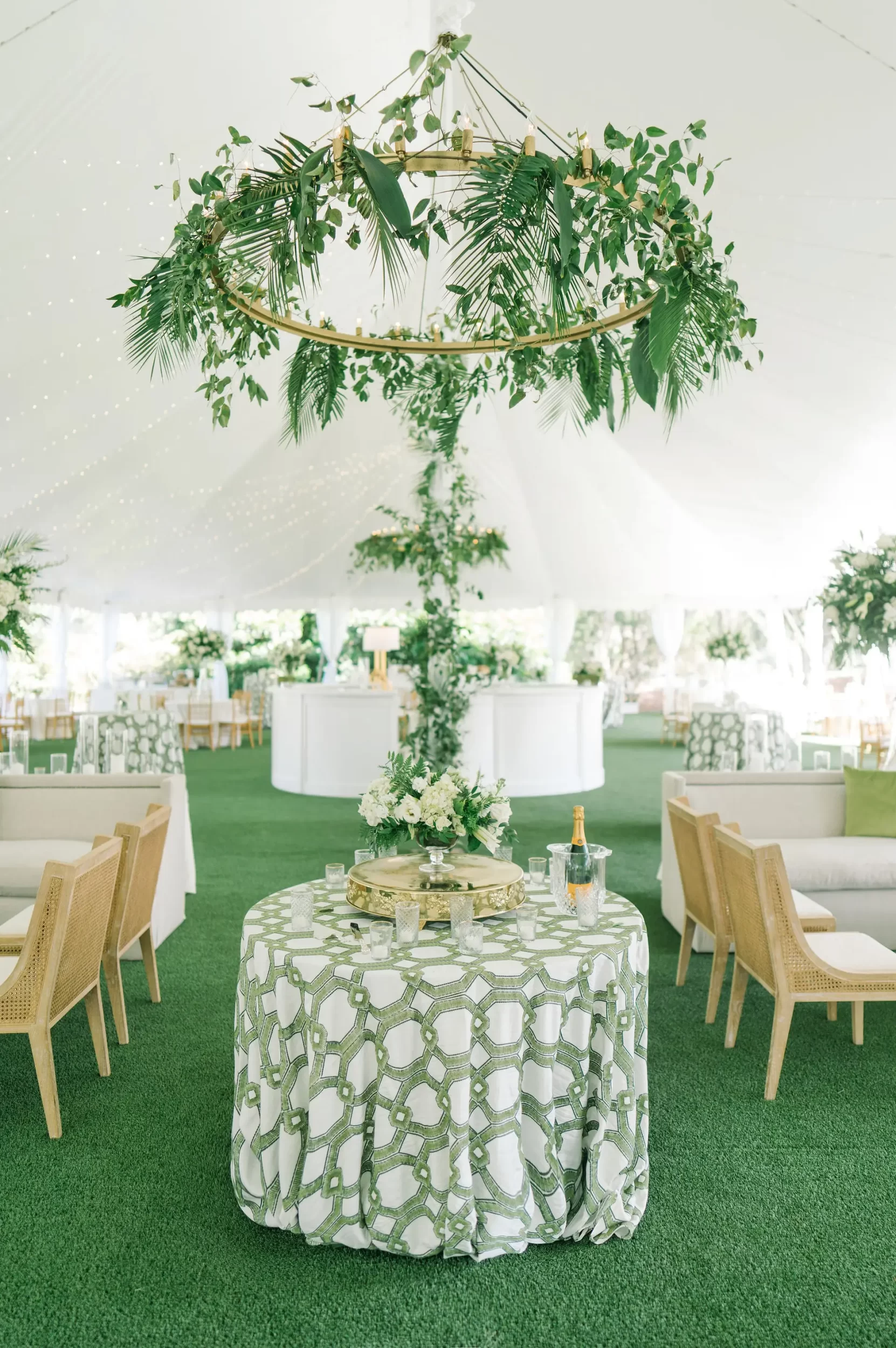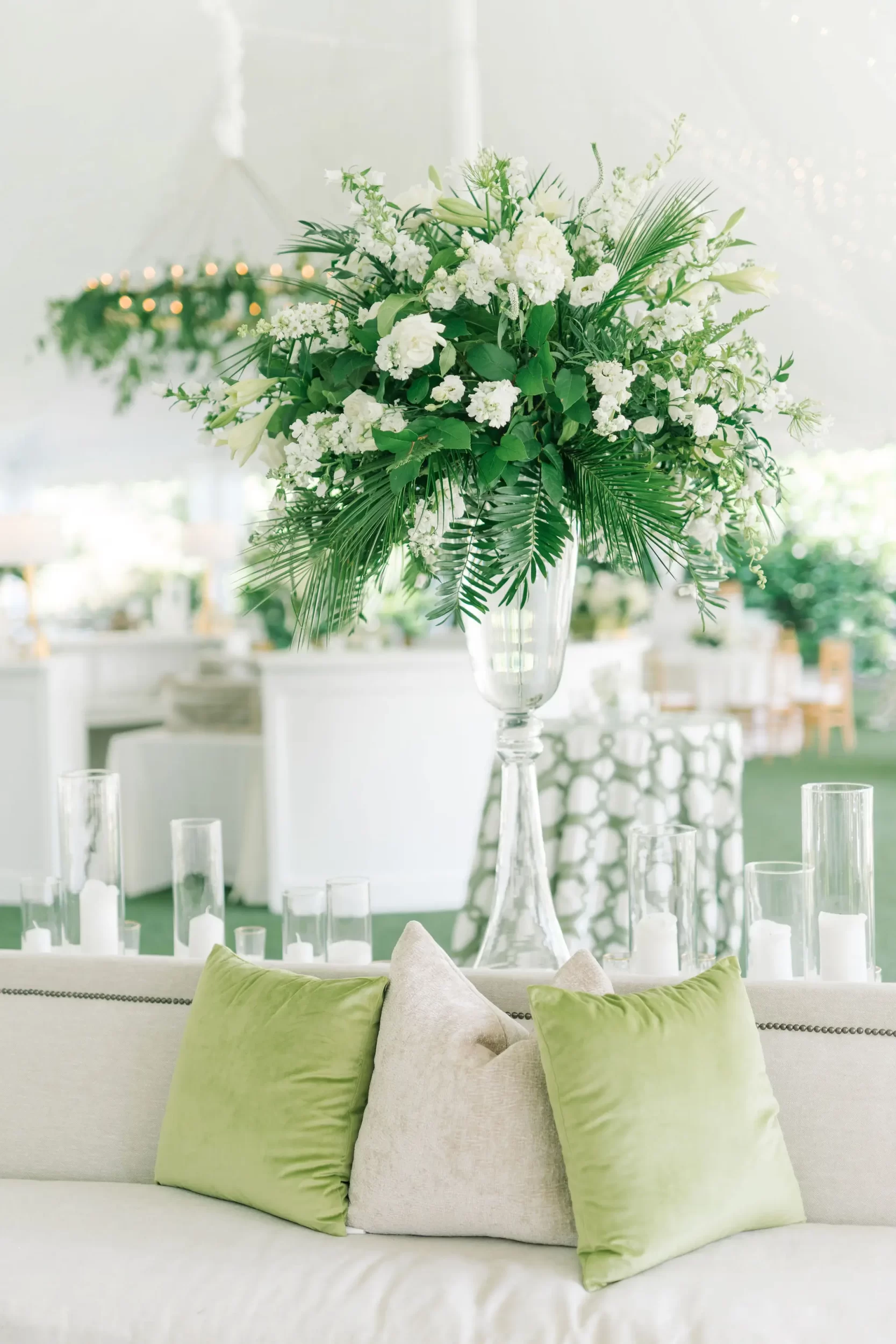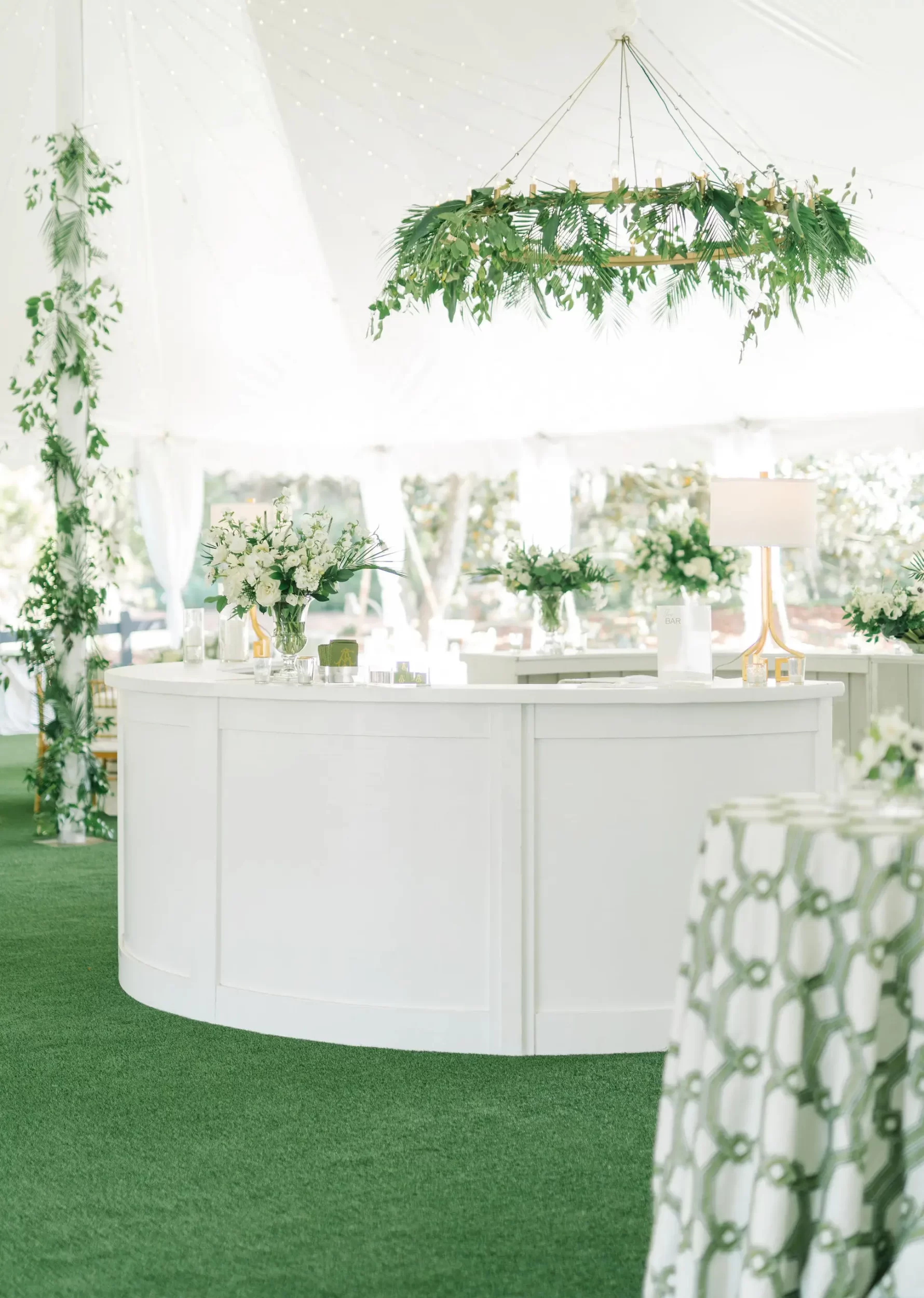 Blythe from Hill & Co worked her signature magic as their wedding planner and designer, creating a soft, romantic look filled with lush greens, clean whites, and subtle touches of gold. The tented reception space was overflowing with greenery — from hanging installations to fresh garlands — making it feel like a garden party in the best way! The white and green lounge setup by Beachview added a cozy touch, perfect for guests to relax and soak in the celebration.
