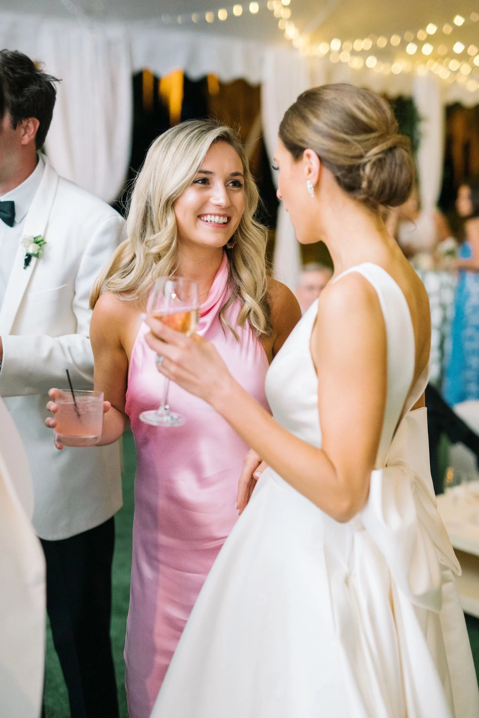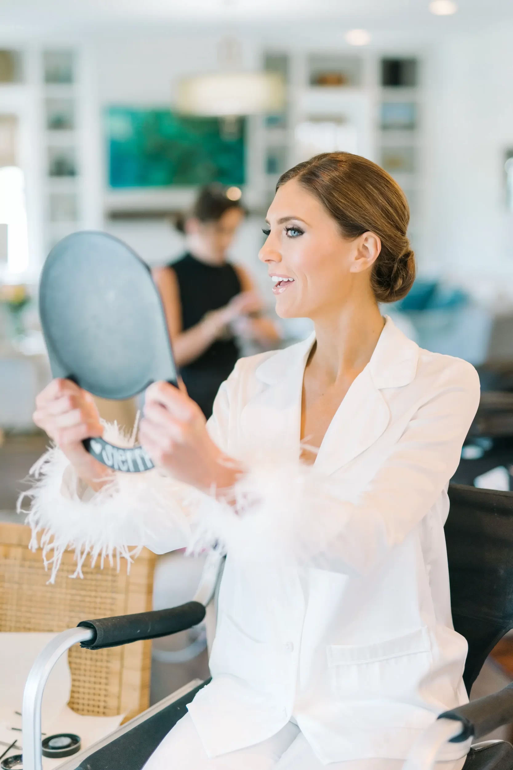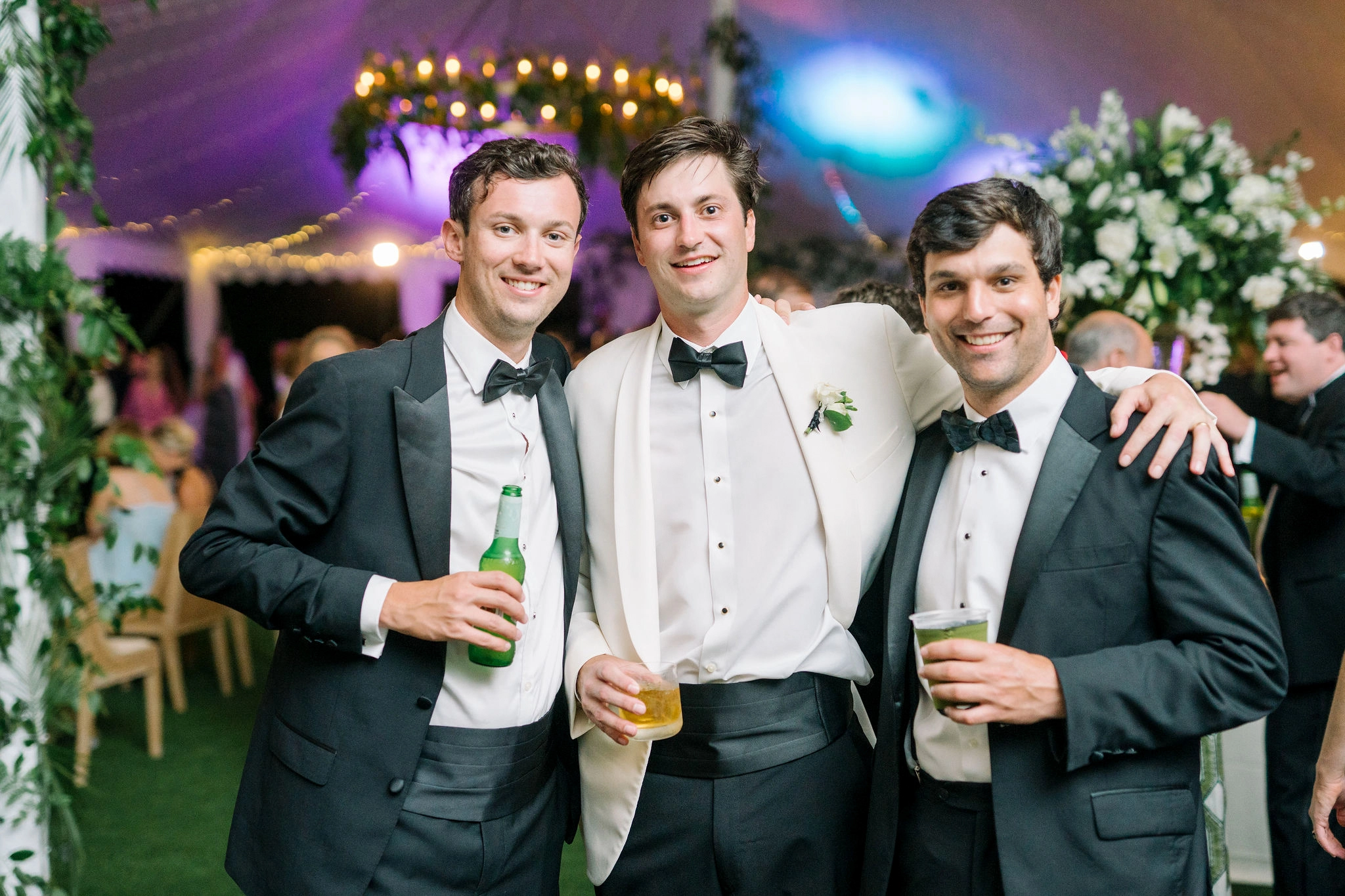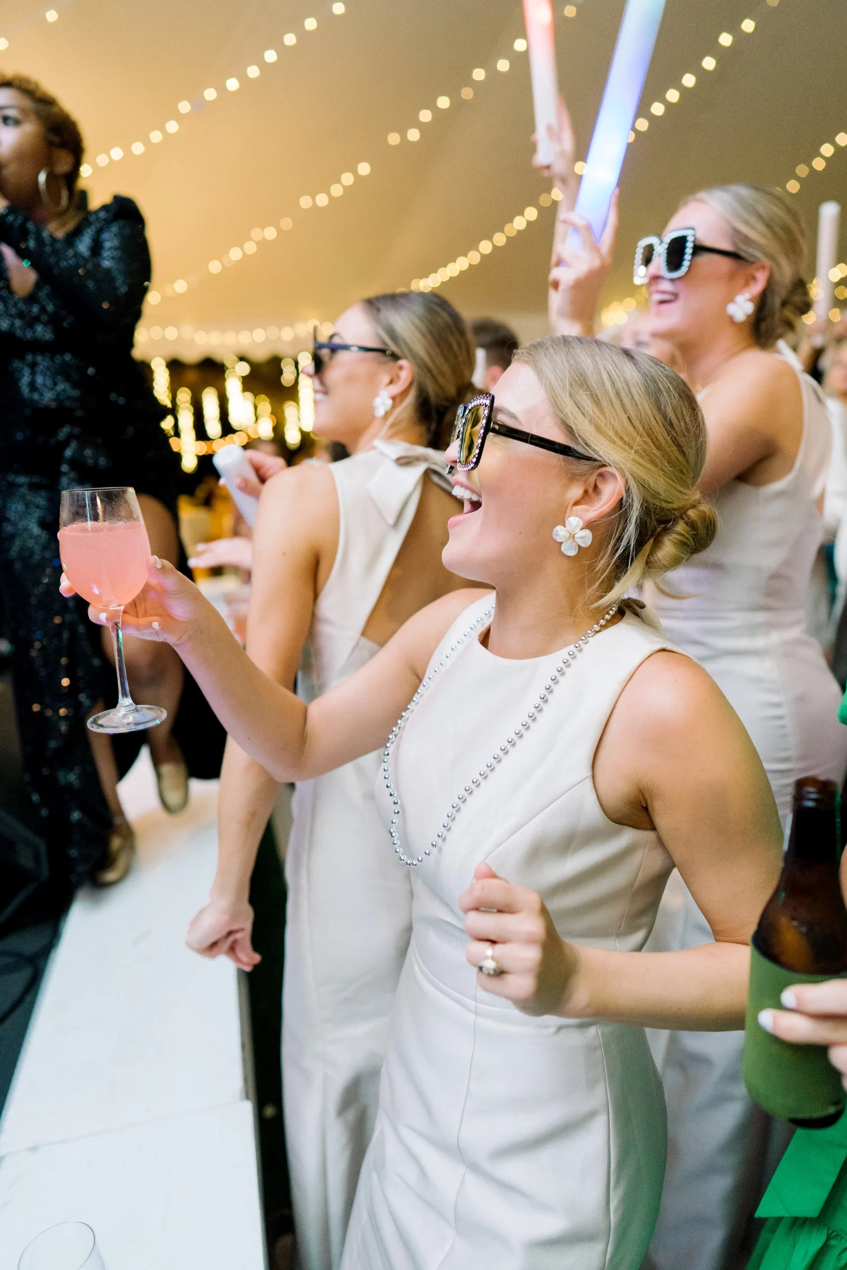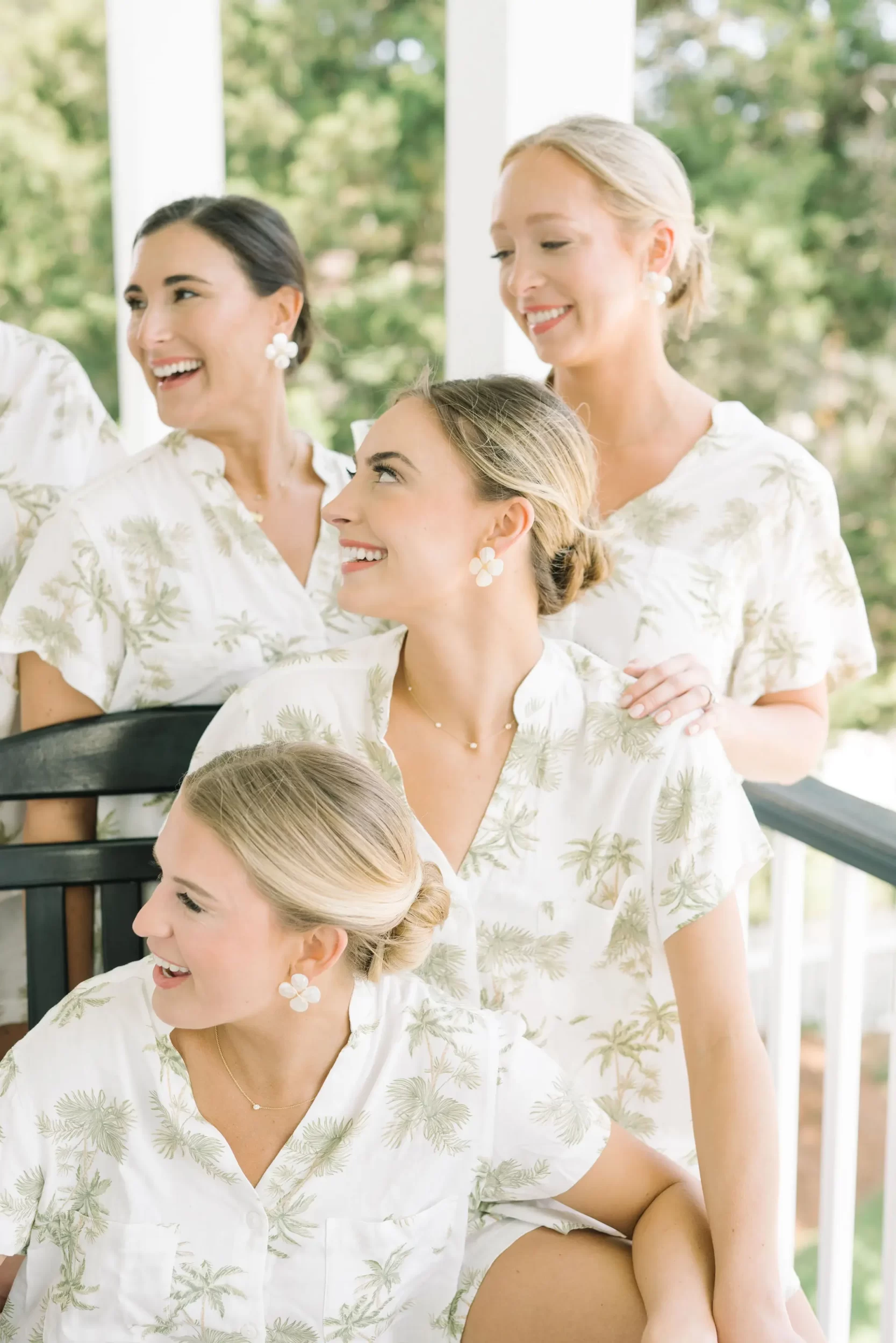 The bridesmaids wore sleek champagne gowns by Alfred Sung, accessorized with pearls from Sidebar Design, and the sweetest pajamas from Piyama during the getting ready moments (we still can’t get over that porch champagne pop!).