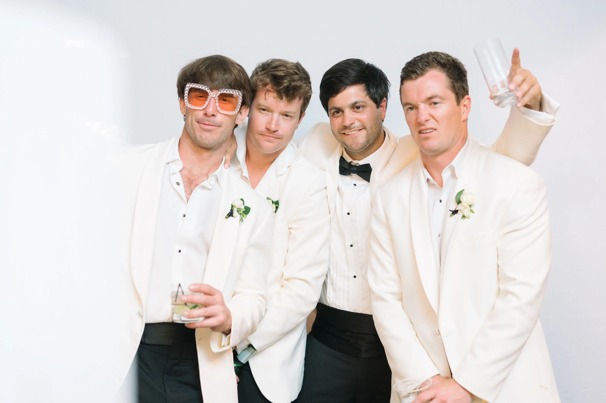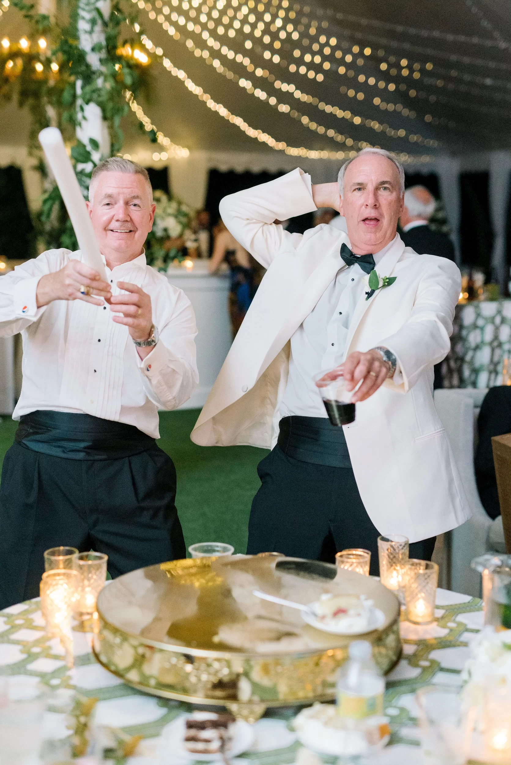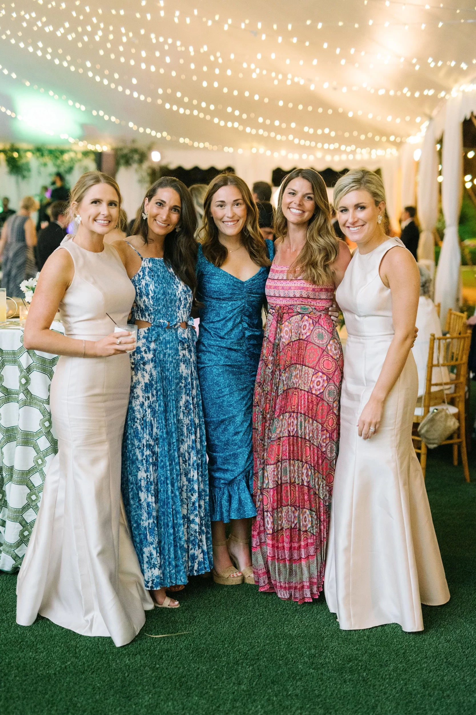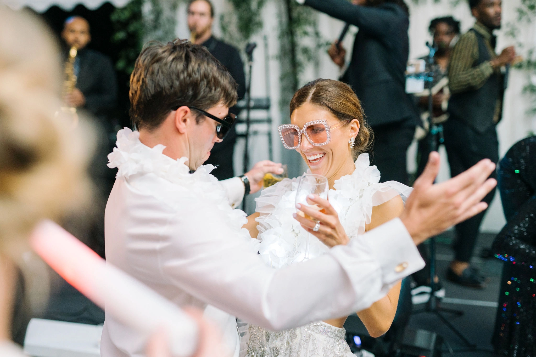 The bridesmaids wore sleek champagne gowns by Alfred Sung, accessorized with pearls from Sidebar Design, and the sweetest pajamas from Piyama during the getting ready moments (we still can’t get over that porch champagne pop!).