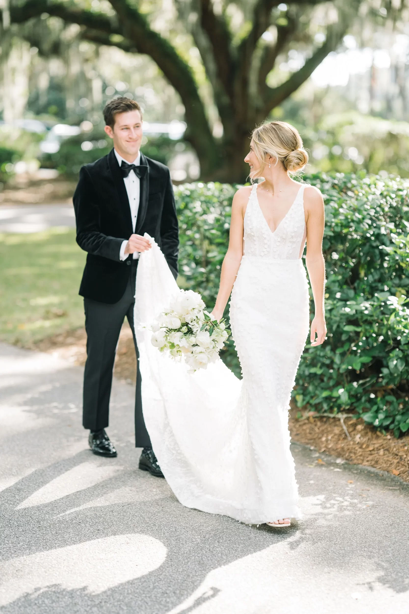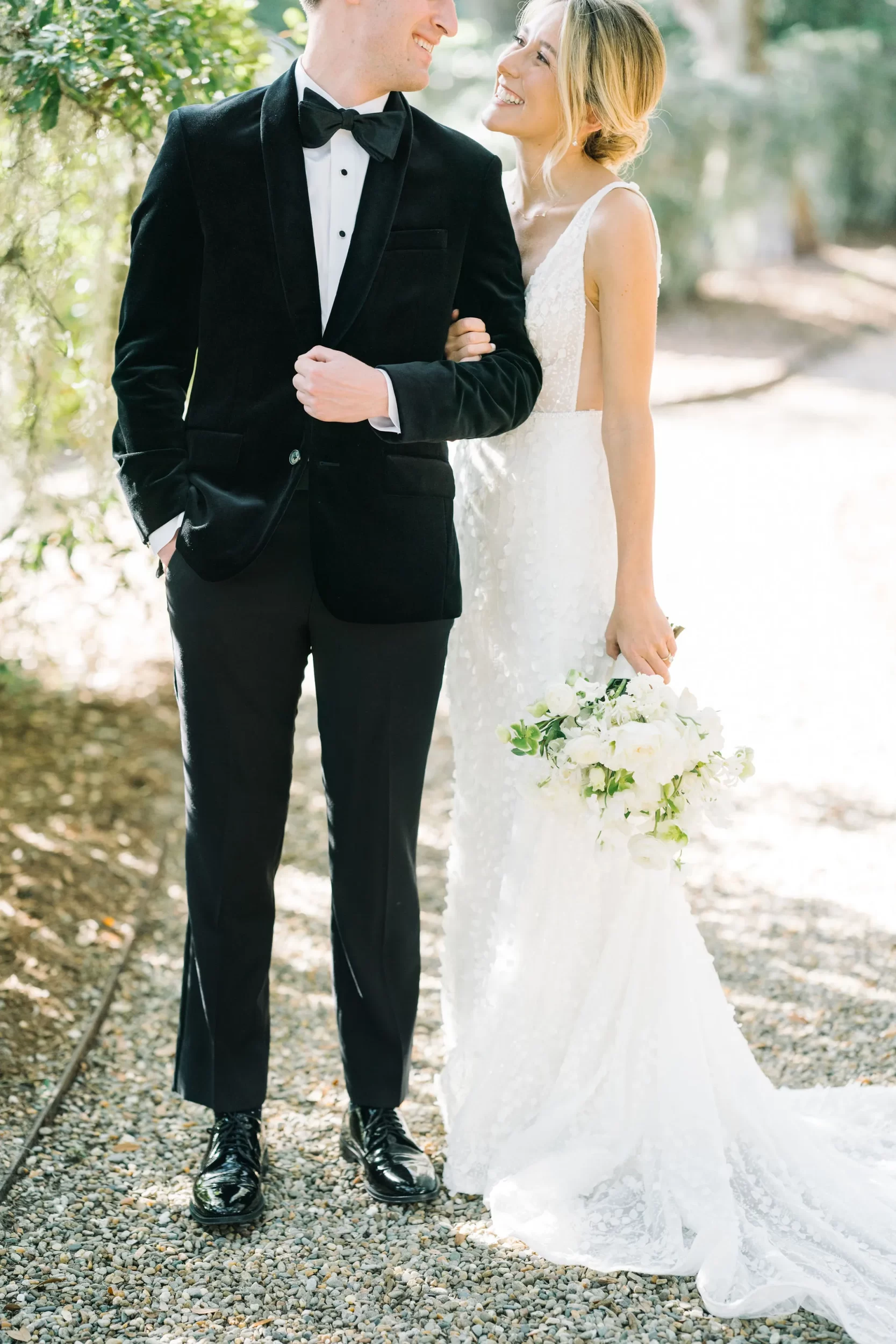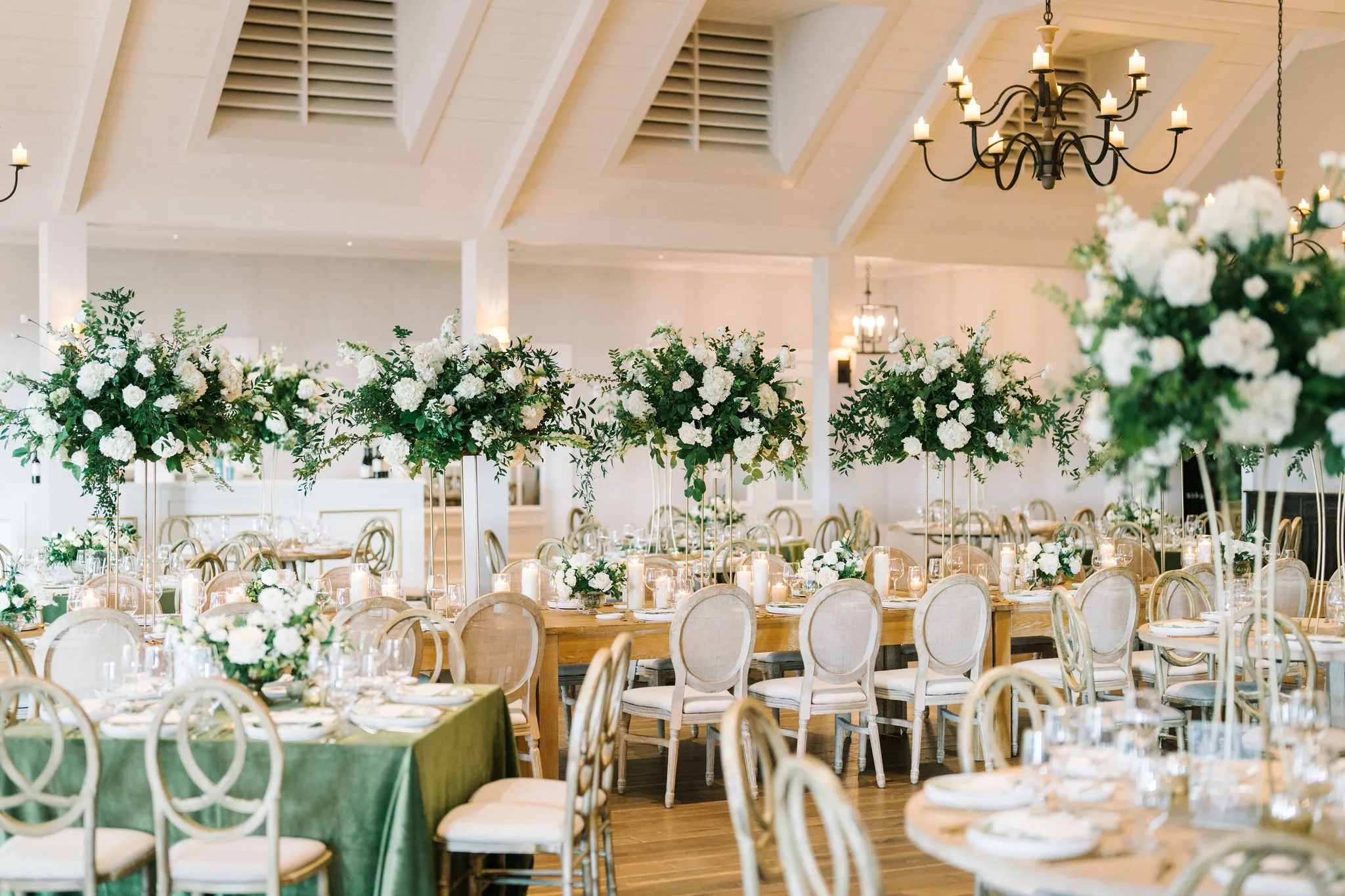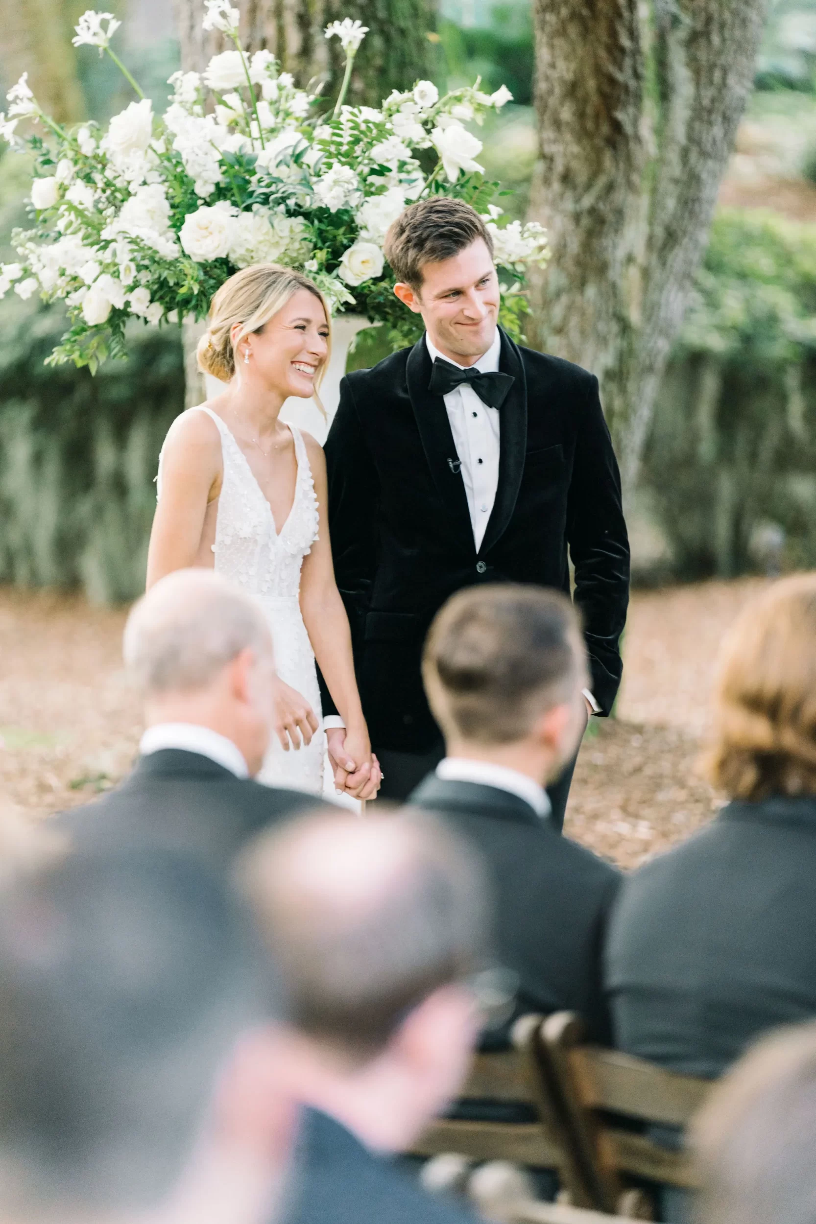 Dinner was served inside the candlelit main ballroom of the River Course, with live jazz music by LePlume, tall floral centerpieces, green velvet details, and creamy white florals from Petaloso that completely transformed the space!! After the sun set, guests were ushered out to a clear-top tent on the back lawn, where the real party began; complete with draping and lighting by Lowcountry Entertainment and dance-floor-packing beats from DJ Wade.