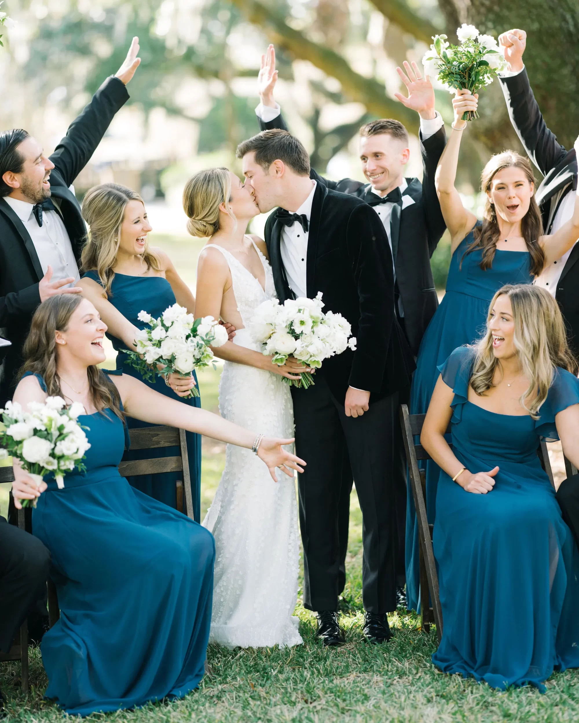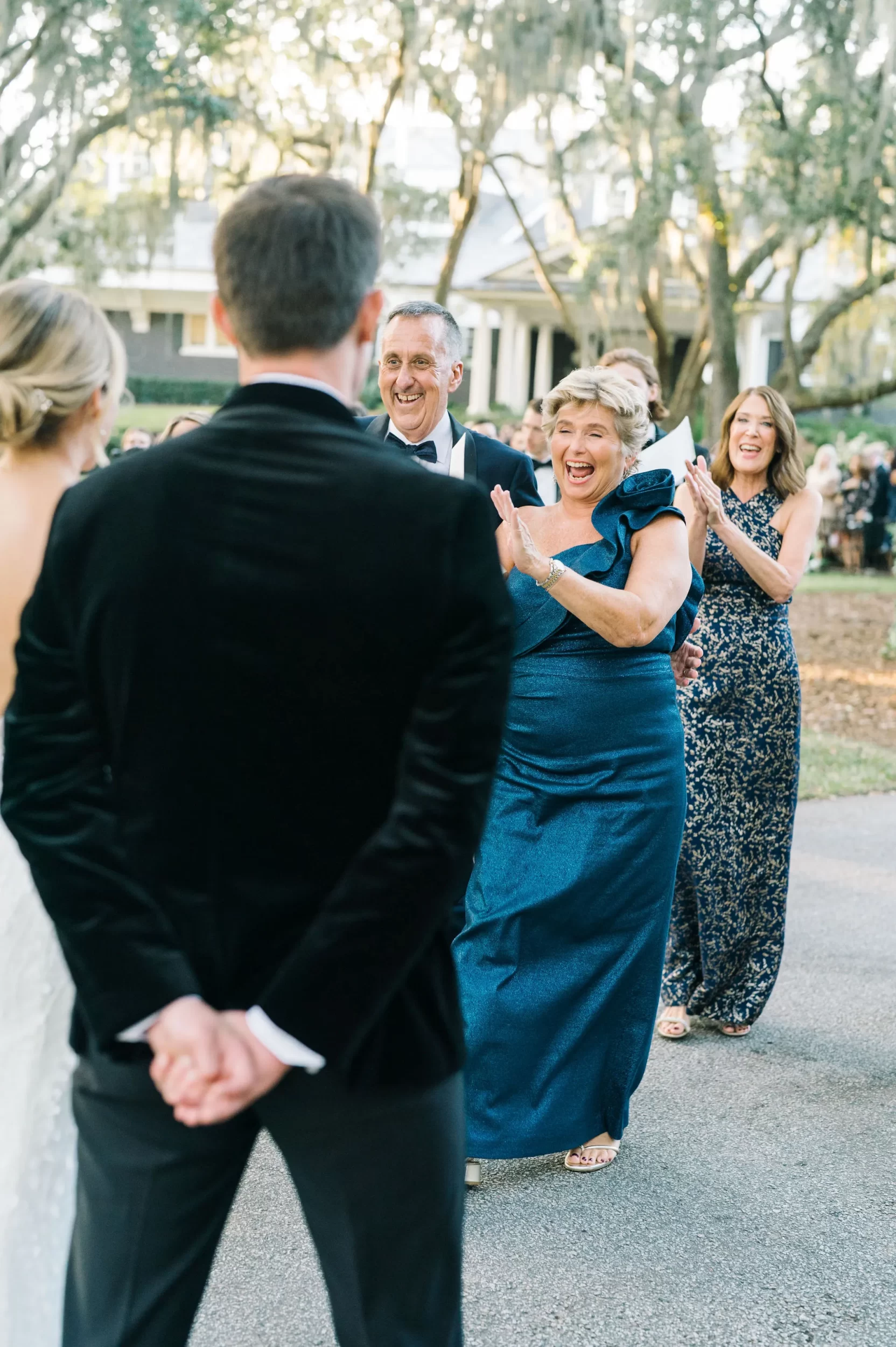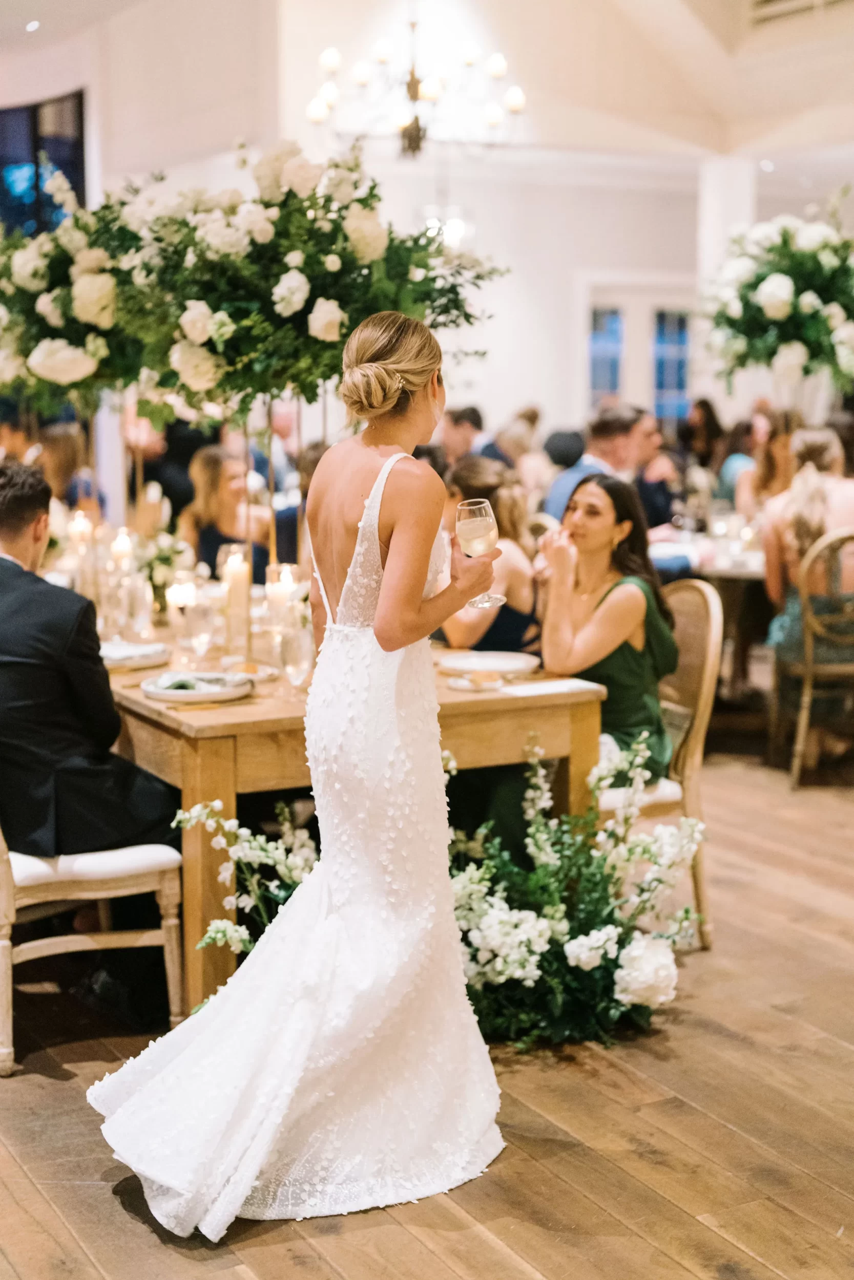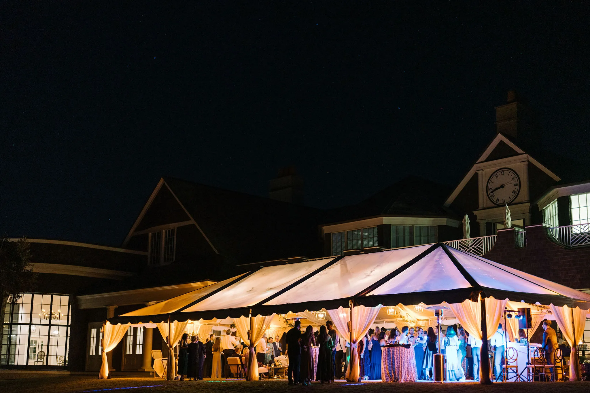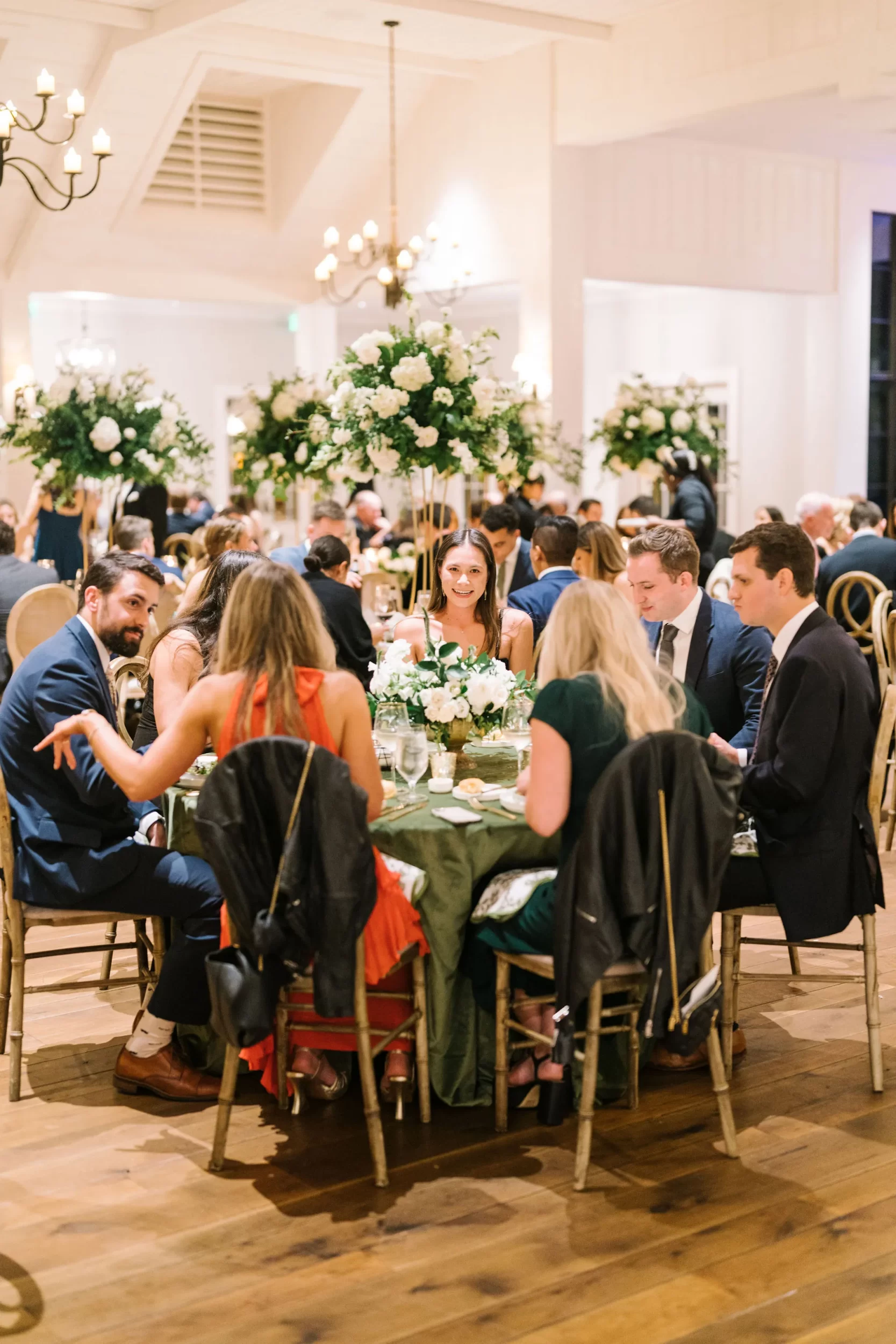 Dinner was served inside the candlelit main ballroom of the River Course, with live jazz music by LePlume, tall floral centerpieces, green velvet details, and creamy white florals from Petaloso that completely transformed the space!! After the sun set, guests were ushered out to a clear-top tent on the back lawn, where the real party began; complete with draping and lighting by Lowcountry Entertainment and dance-floor-packing beats from DJ Wade.