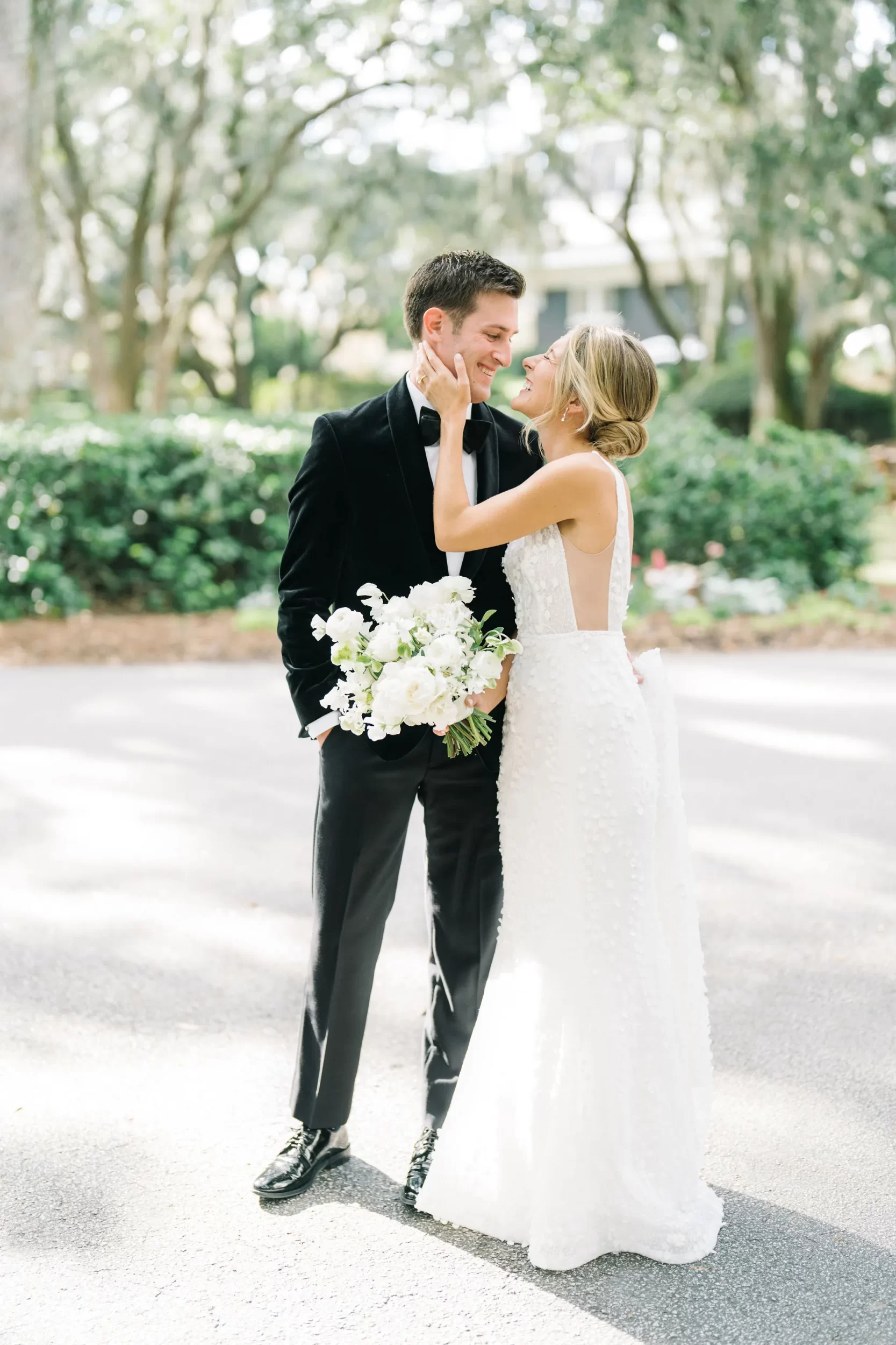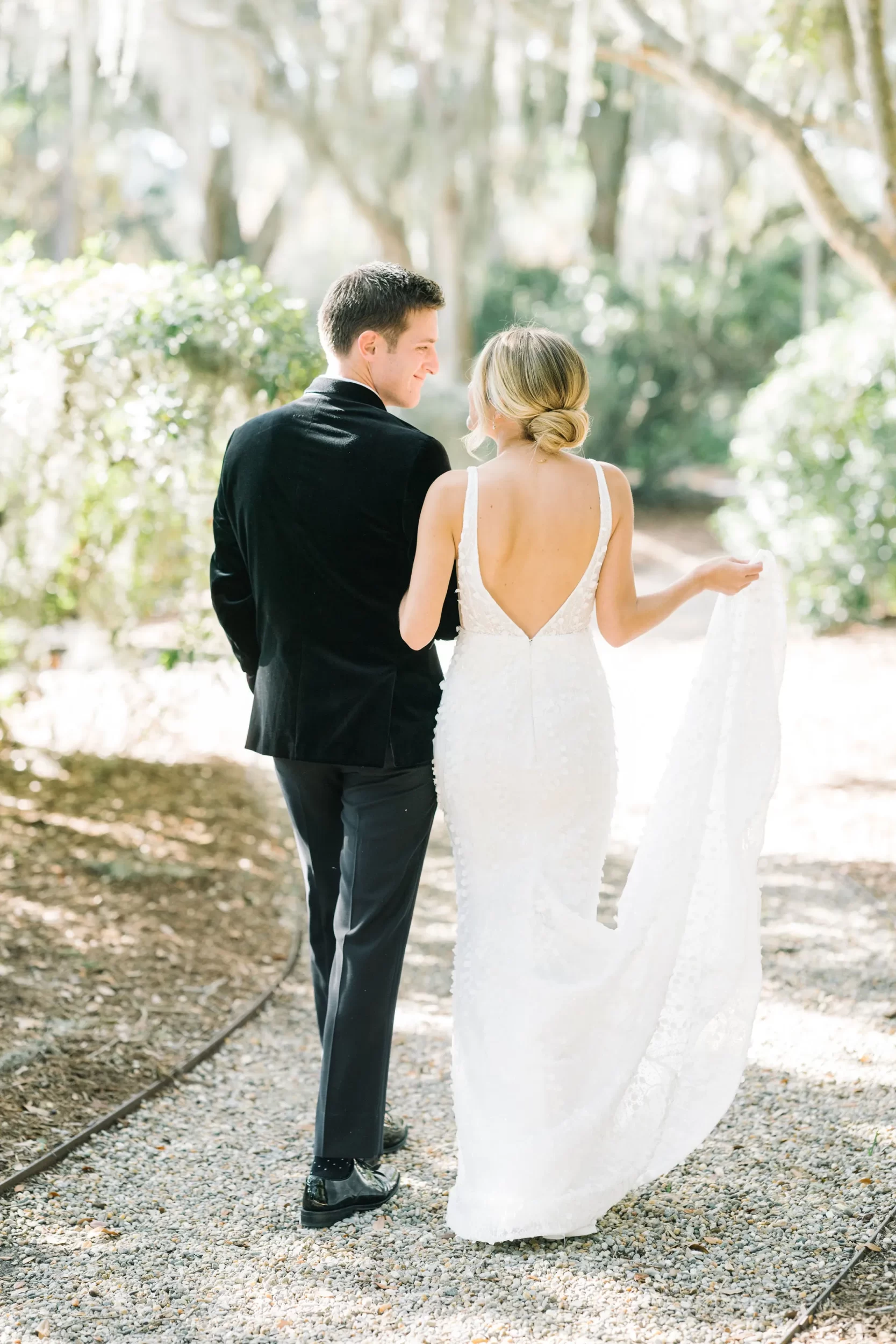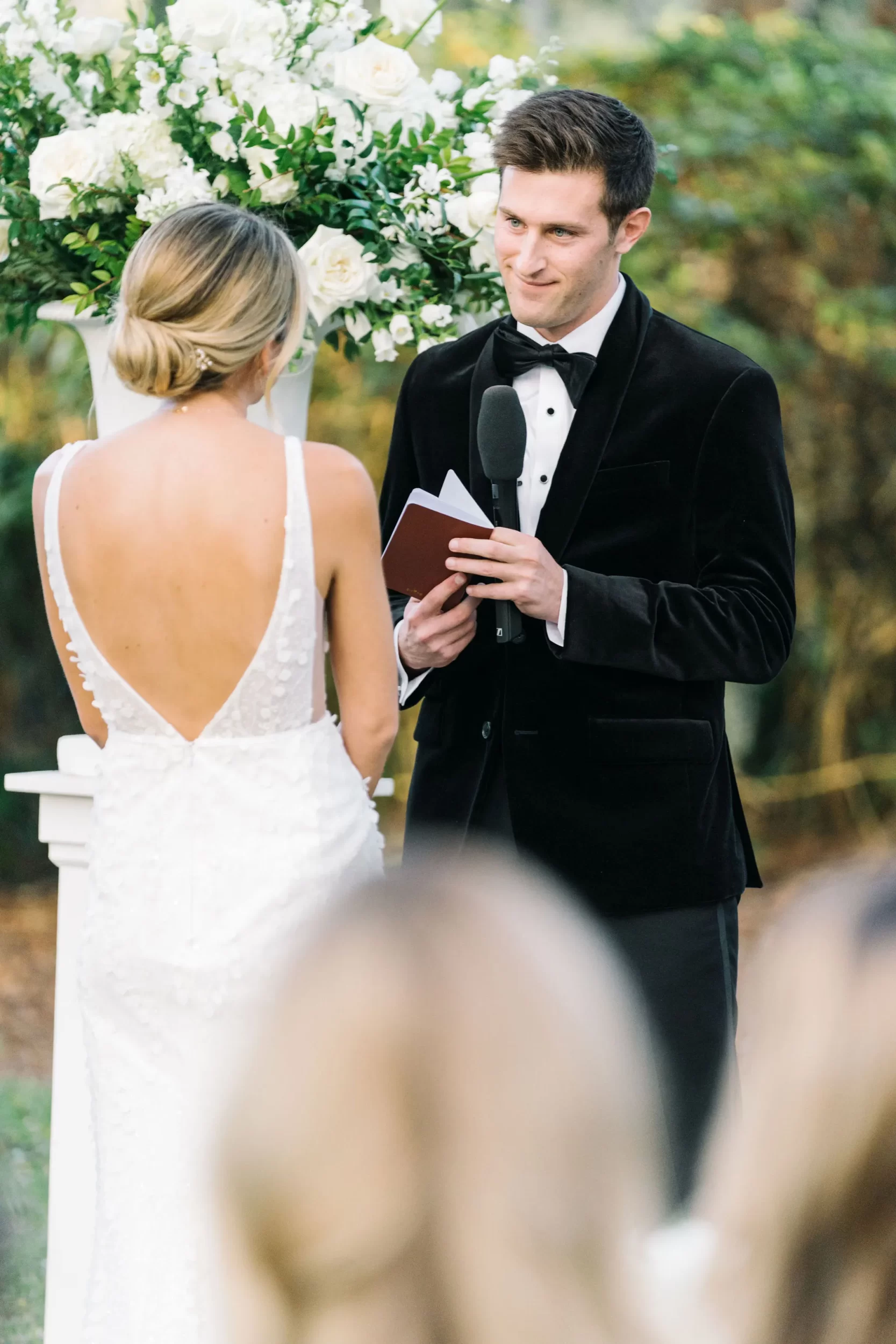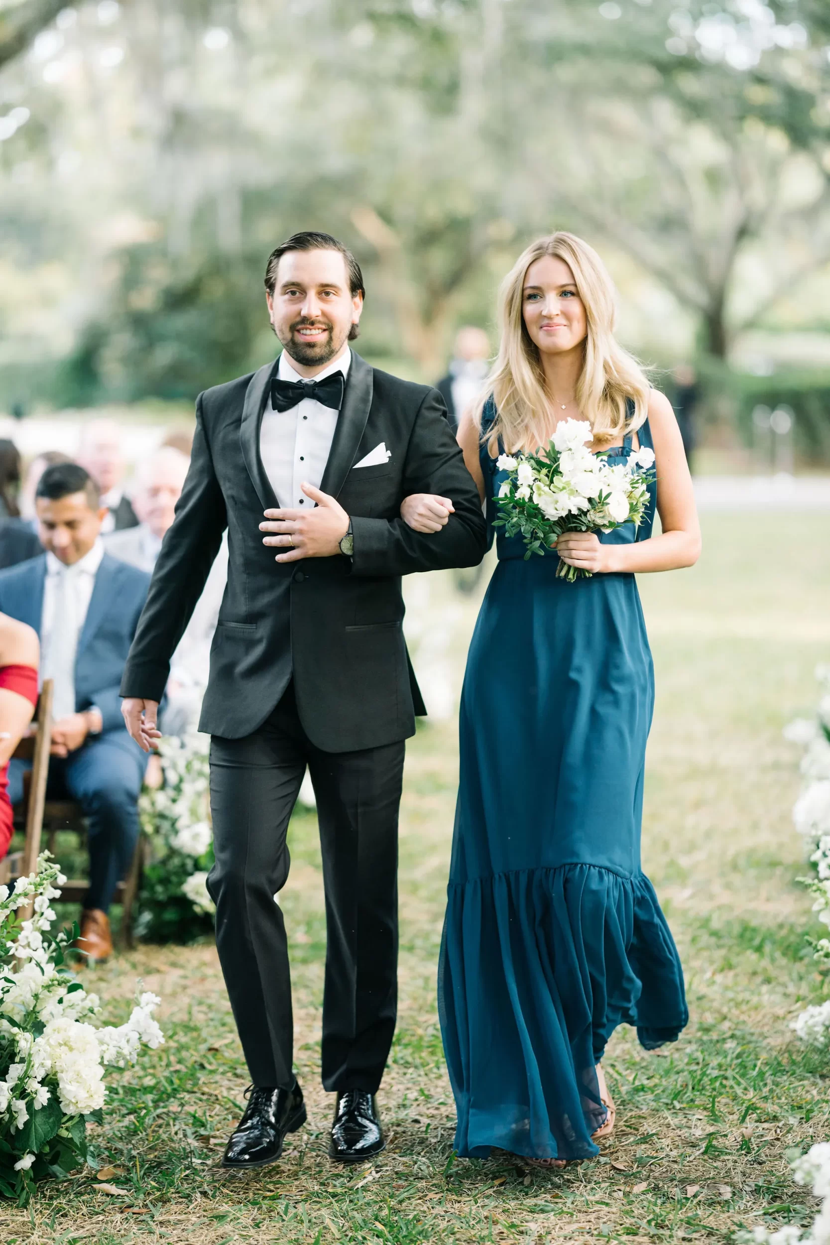 Dinner was served inside the candlelit main ballroom of the River Course, with live jazz music by LePlume, tall floral centerpieces, green velvet details, and creamy white florals from Petaloso that completely transformed the space!! After the sun set, guests were ushered out to a clear-top tent on the back lawn, where the real party began; complete with draping and lighting by Lowcountry Entertainment and dance-floor-packing beats from DJ Wade.