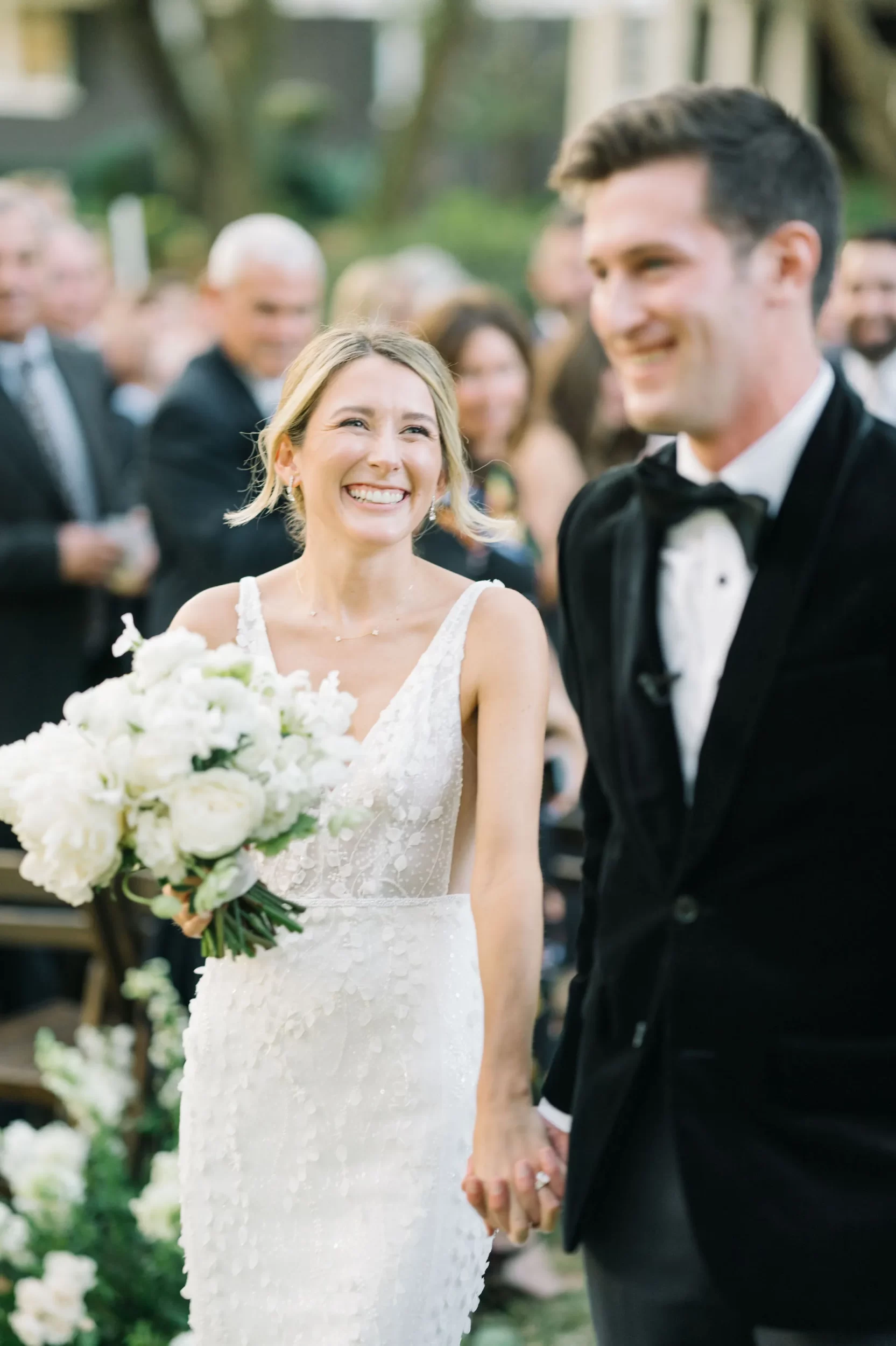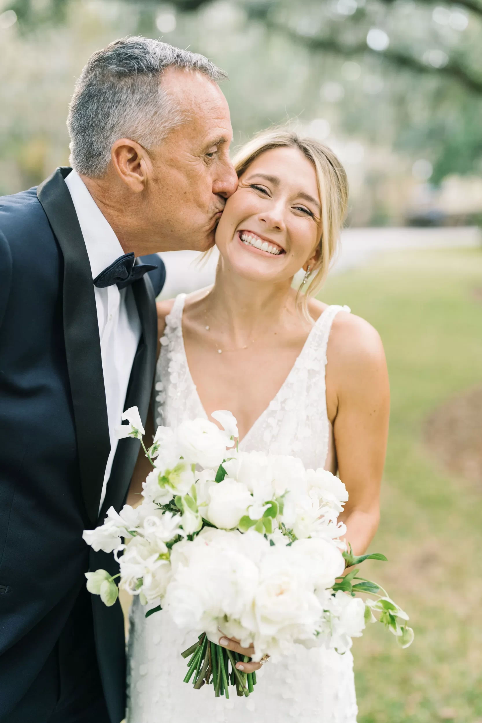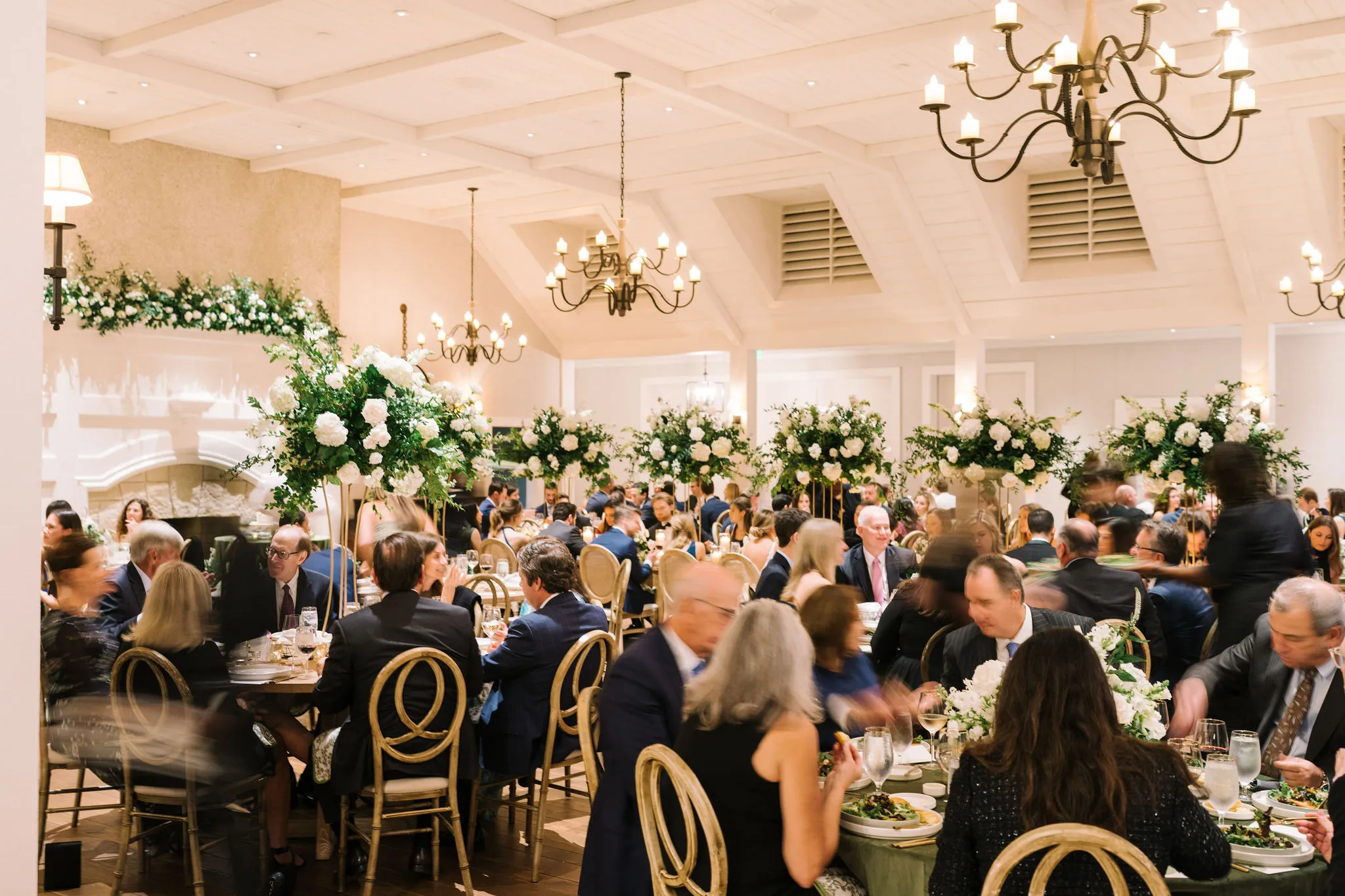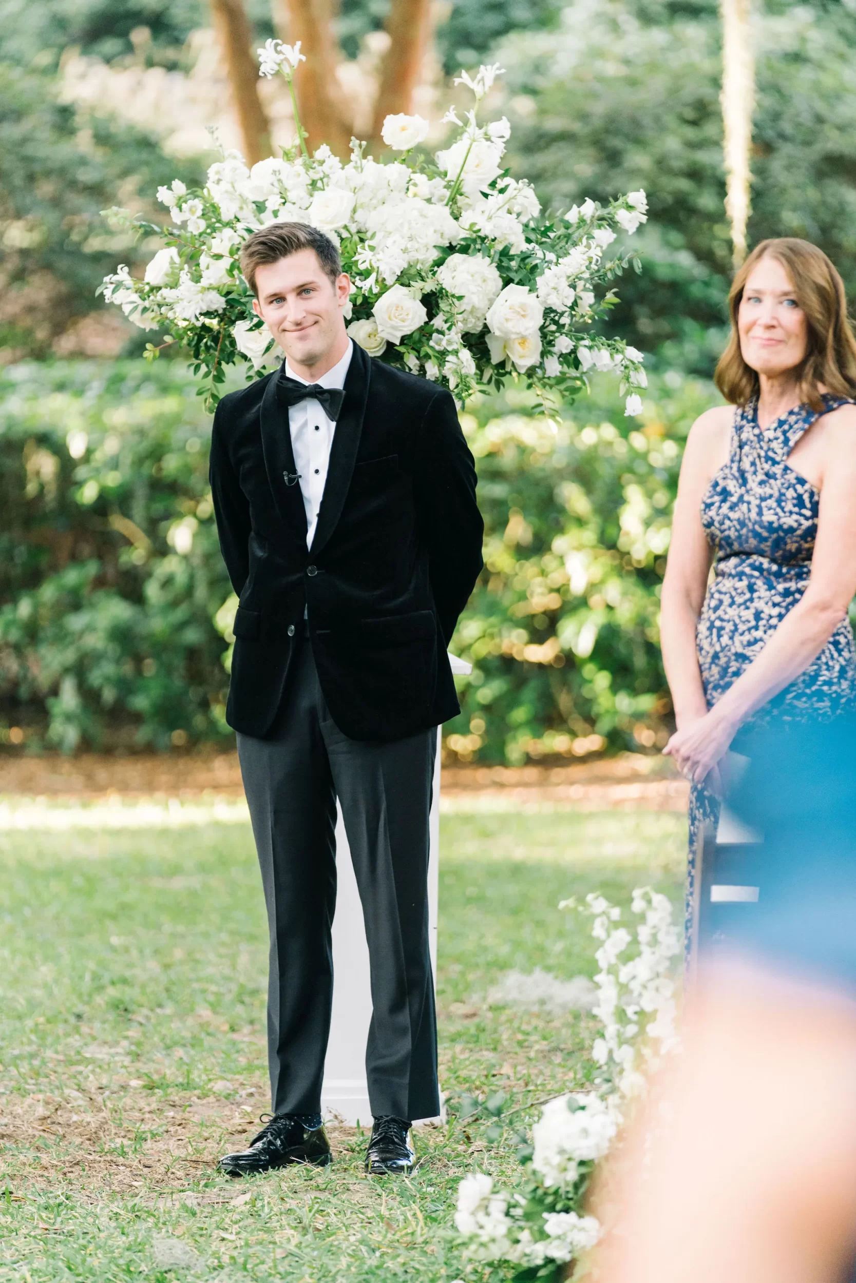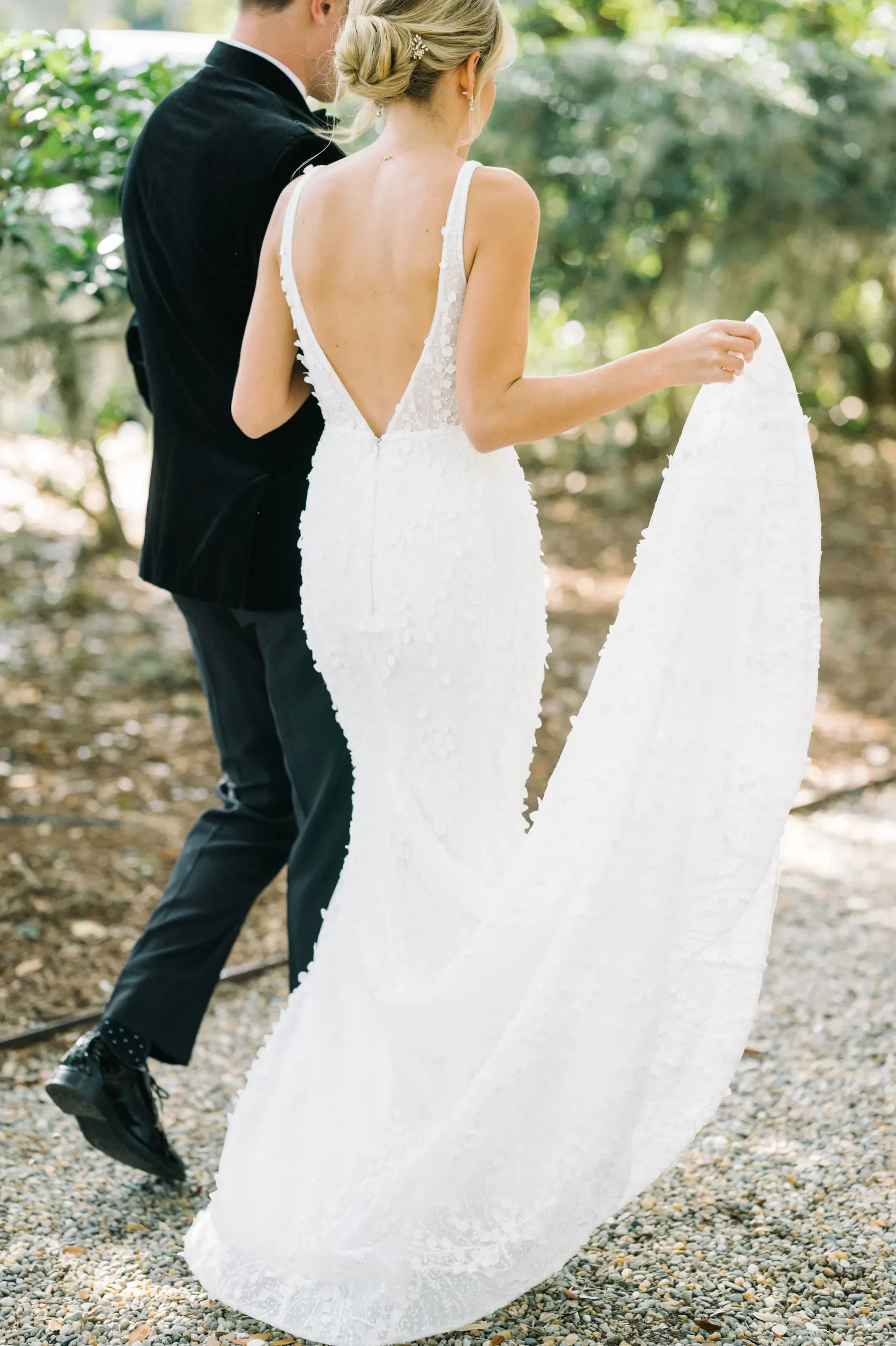 Dinner was served inside the candlelit main ballroom of the River Course, with live jazz music by LePlume, tall floral centerpieces, green velvet details, and creamy white florals from Petaloso that completely transformed the space!! After the sun set, guests were ushered out to a clear-top tent on the back lawn, where the real party began; complete with draping and lighting by Lowcountry Entertainment and dance-floor-packing beats from DJ Wade.