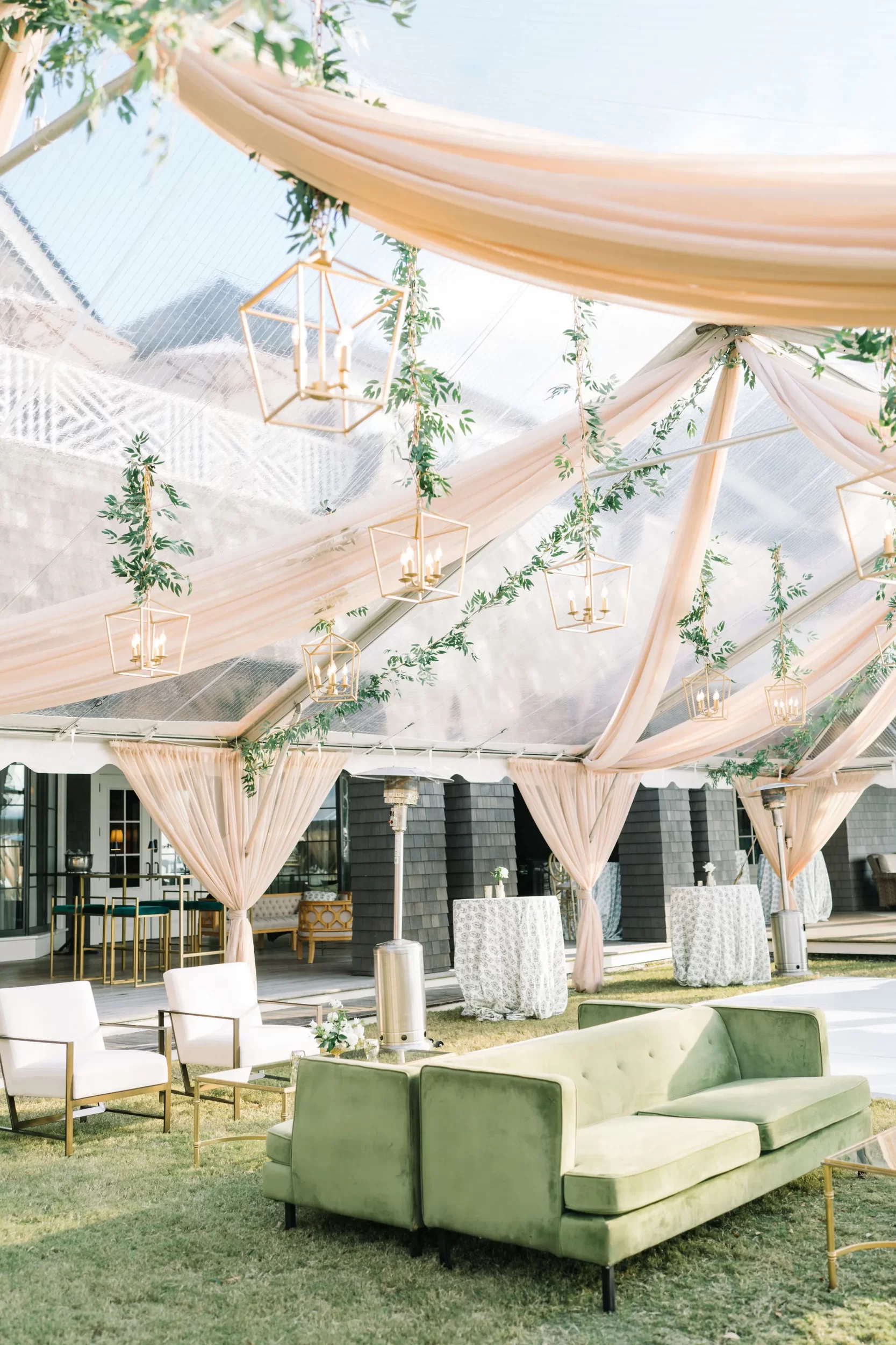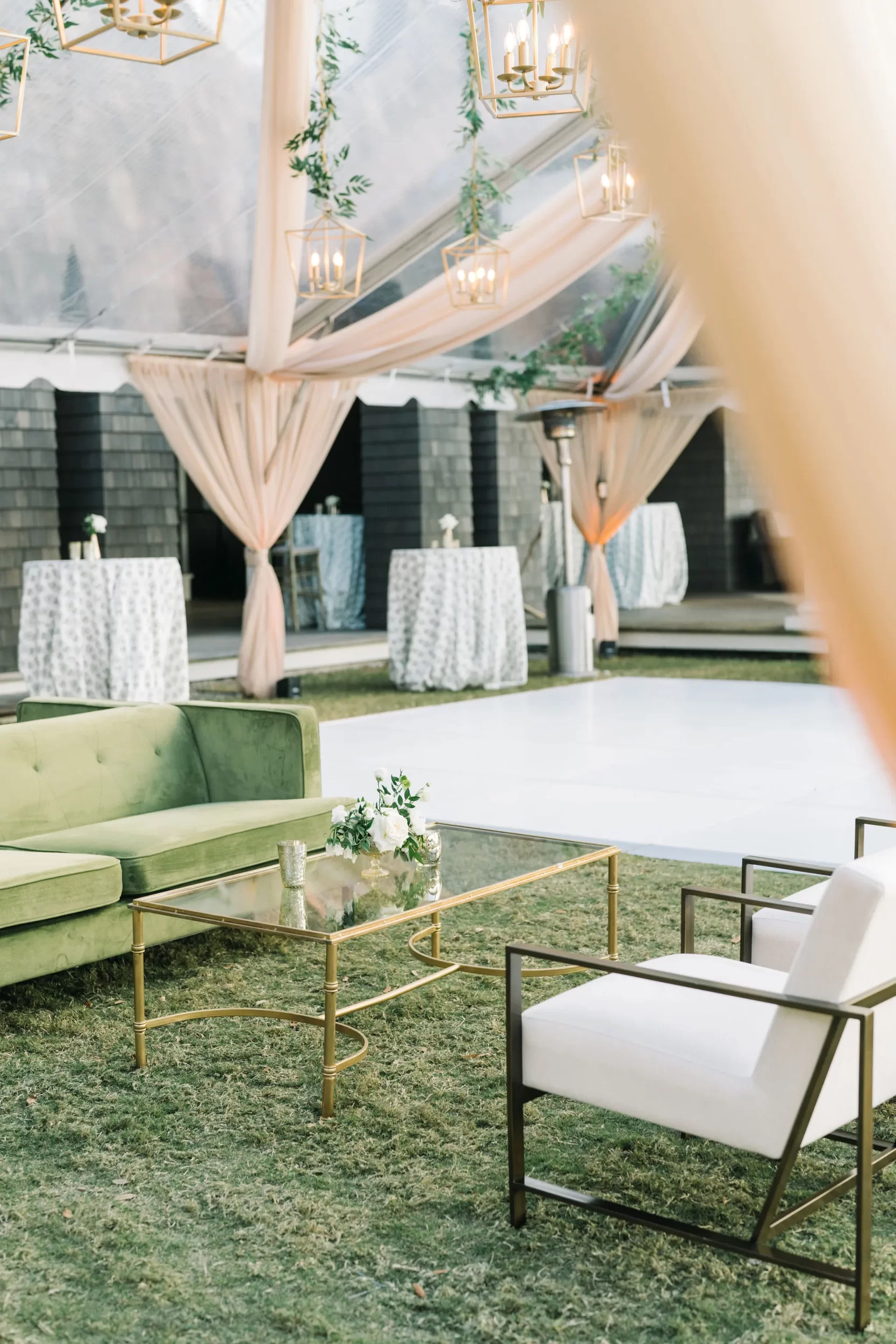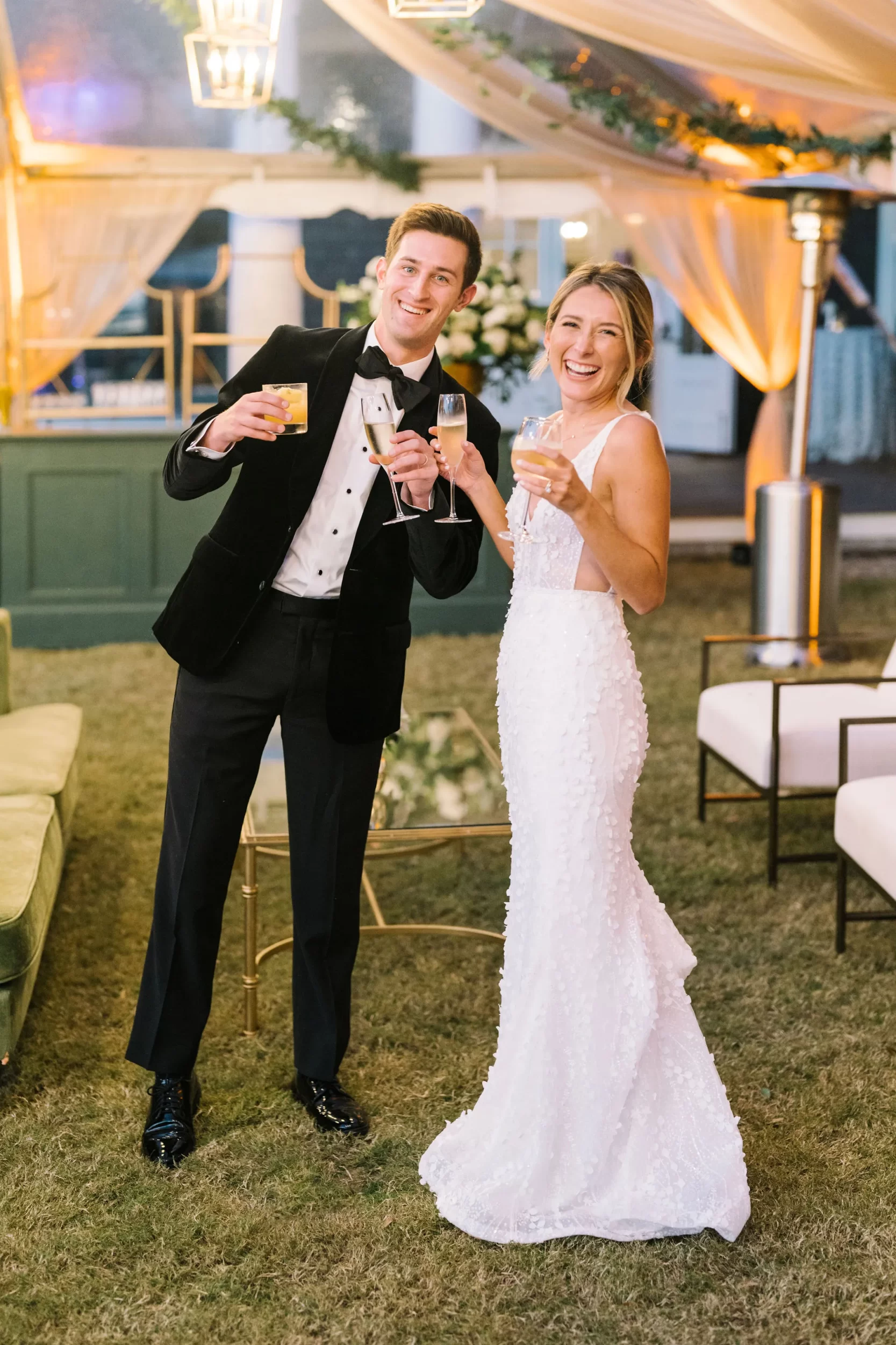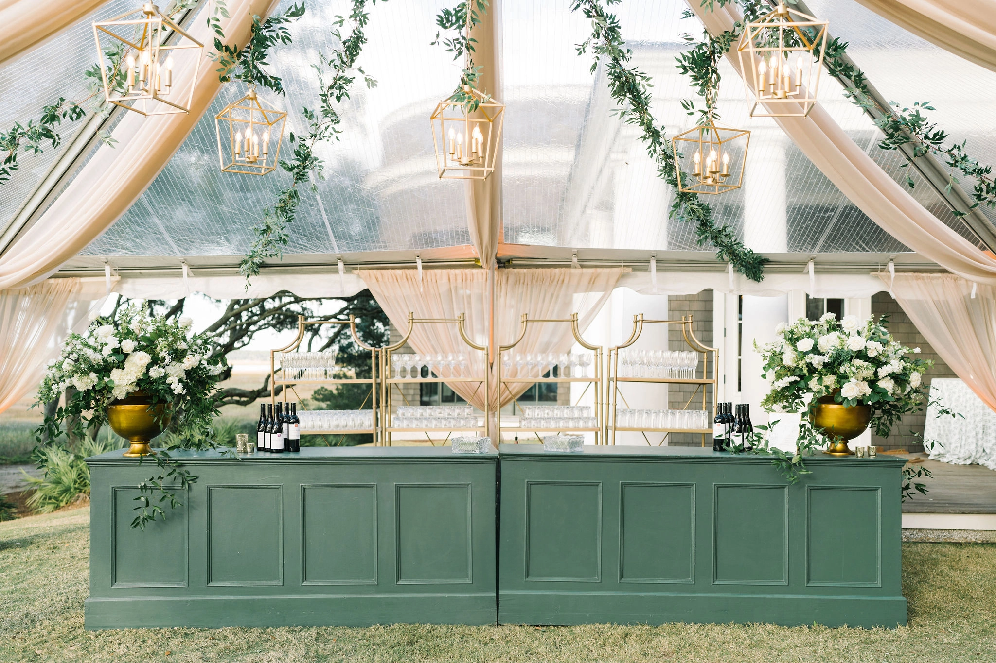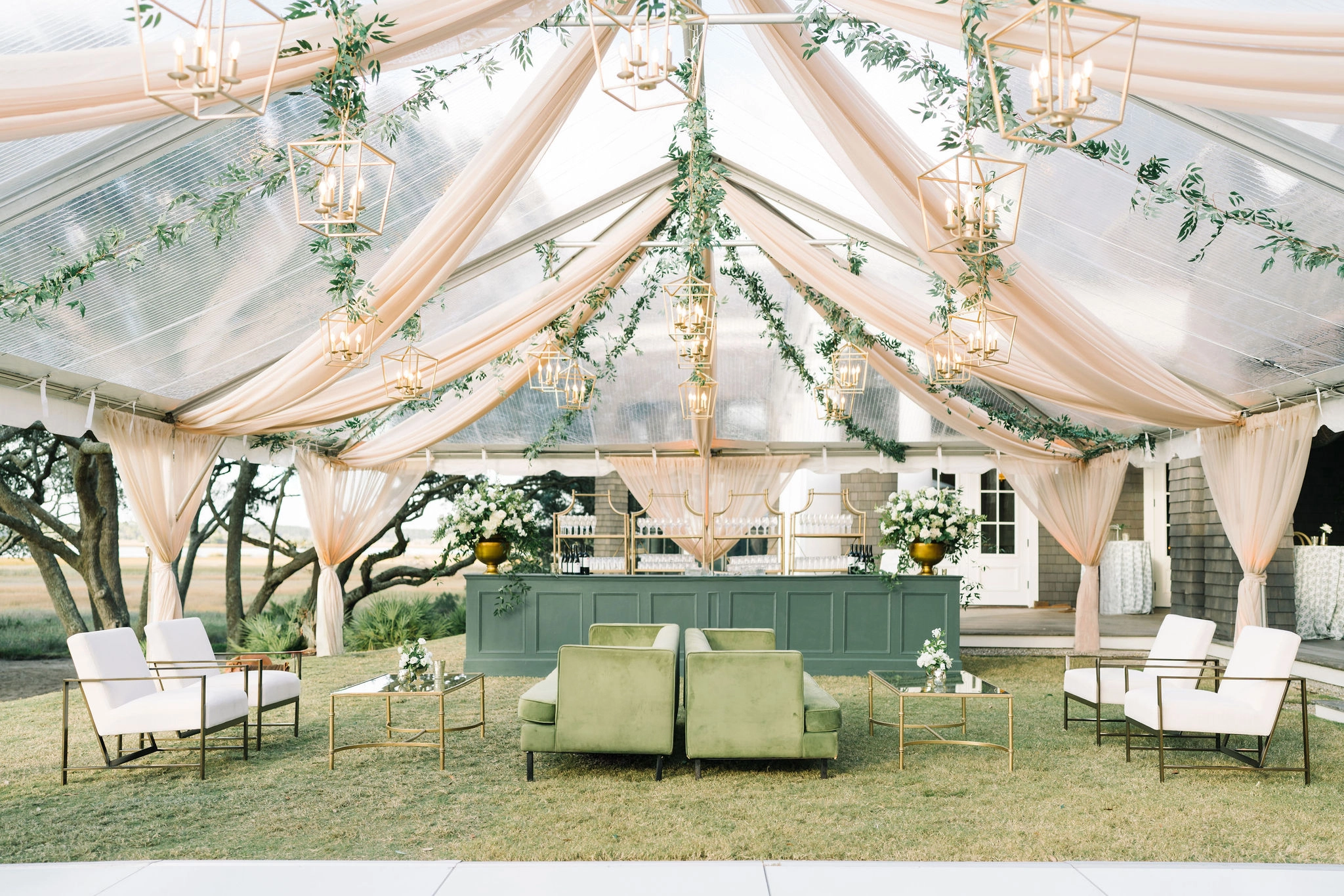 For the reception, guests enjoyed a custom dinner by Kiawah Island Club Catering, a stunning three-tiered cake by Ashley Bakery, and late-night dancing under the stars — complete with cozy green velvet lounge setups from EventWorks and floral covered bars framed by gold lanterns and draped greenery! It was such a gorgeous day!