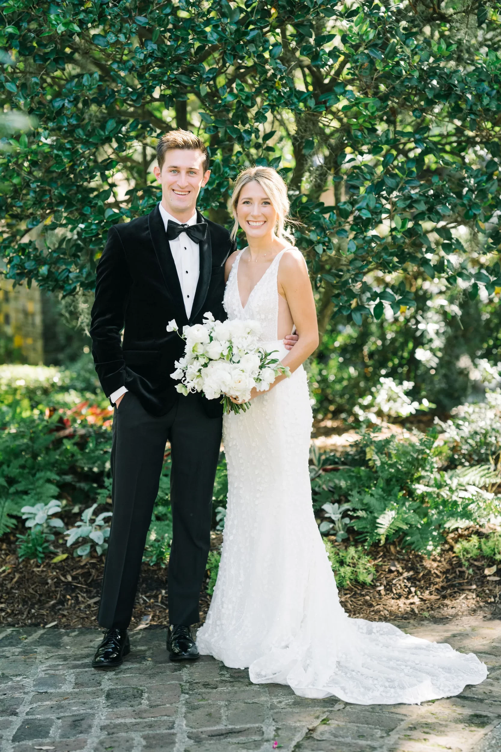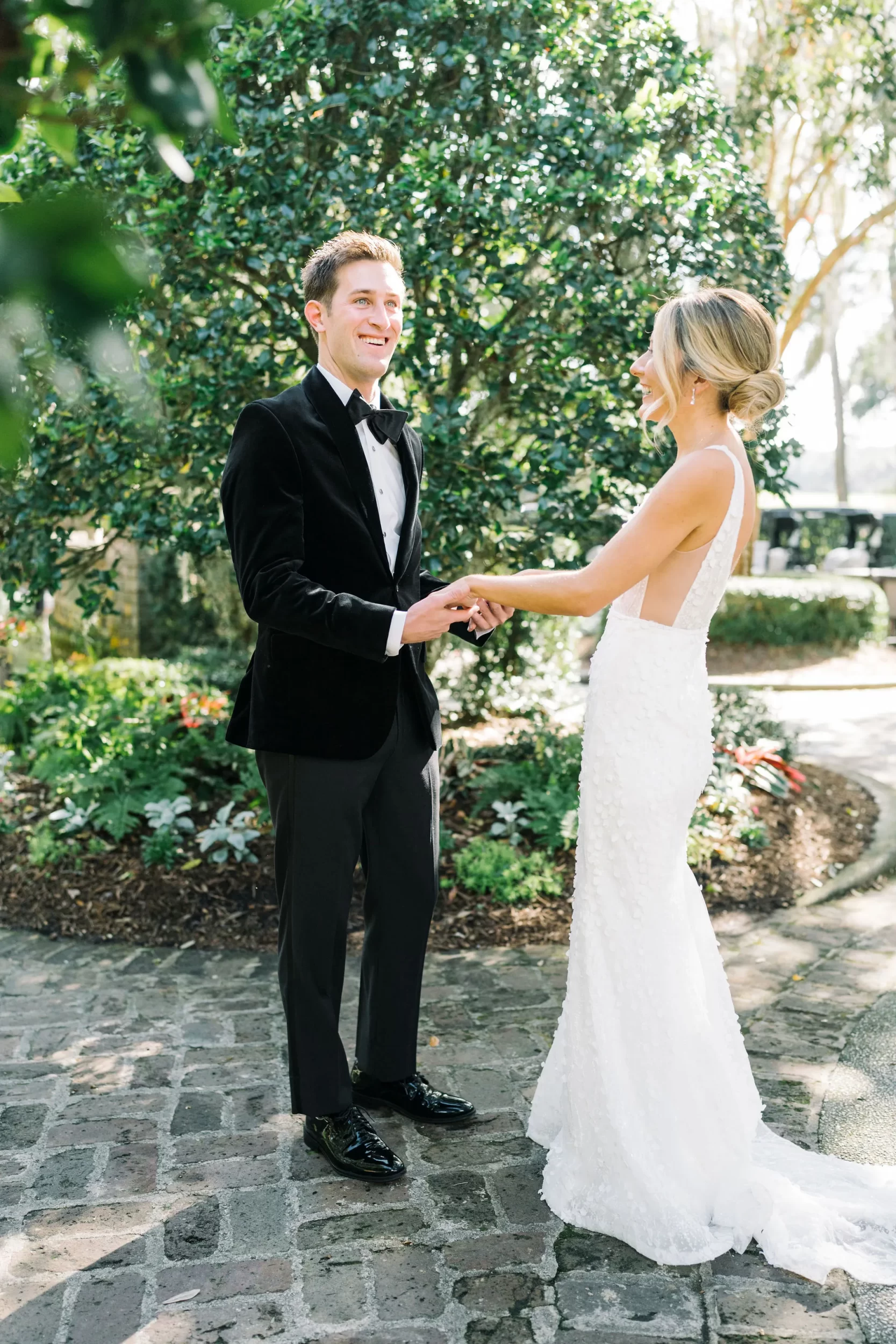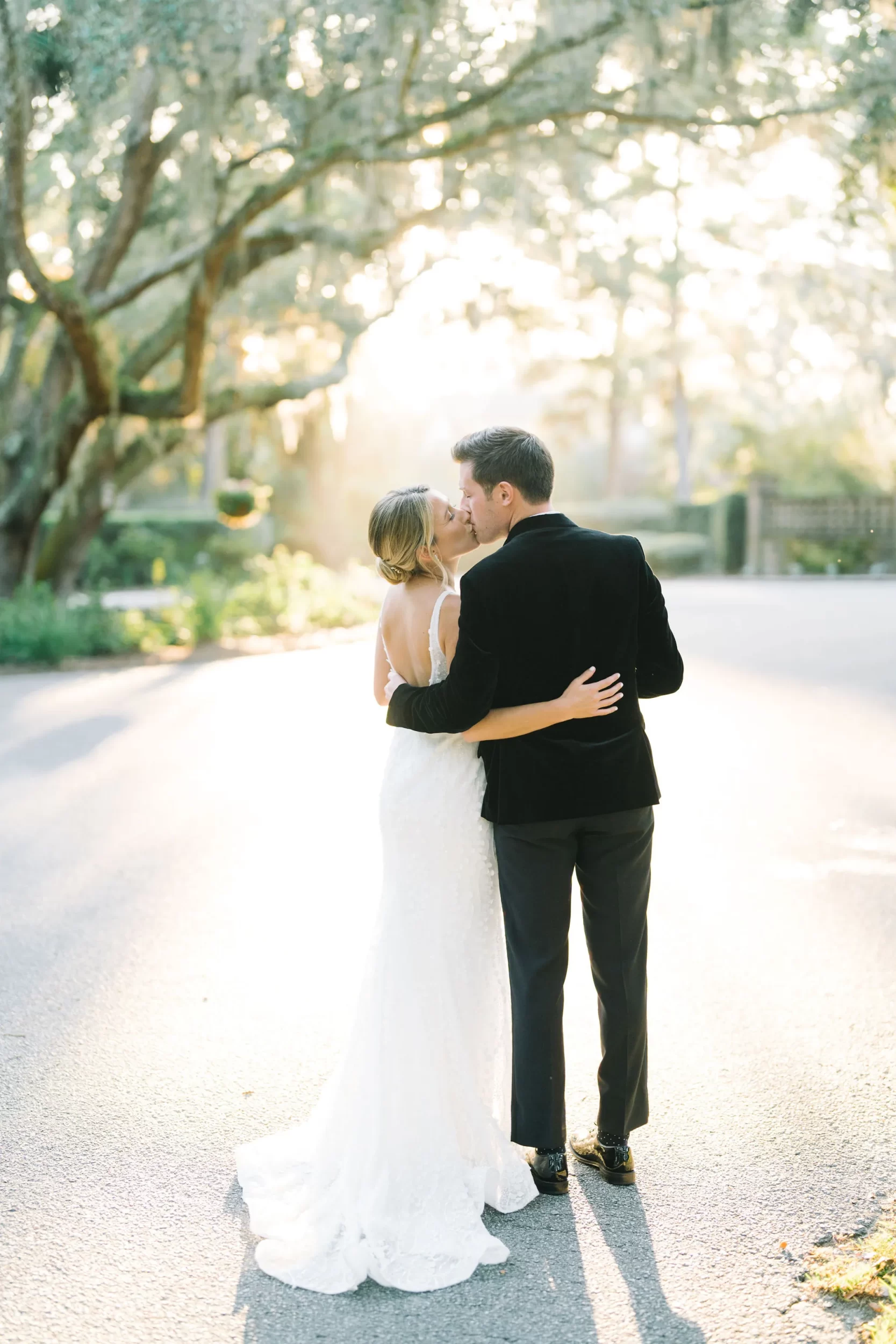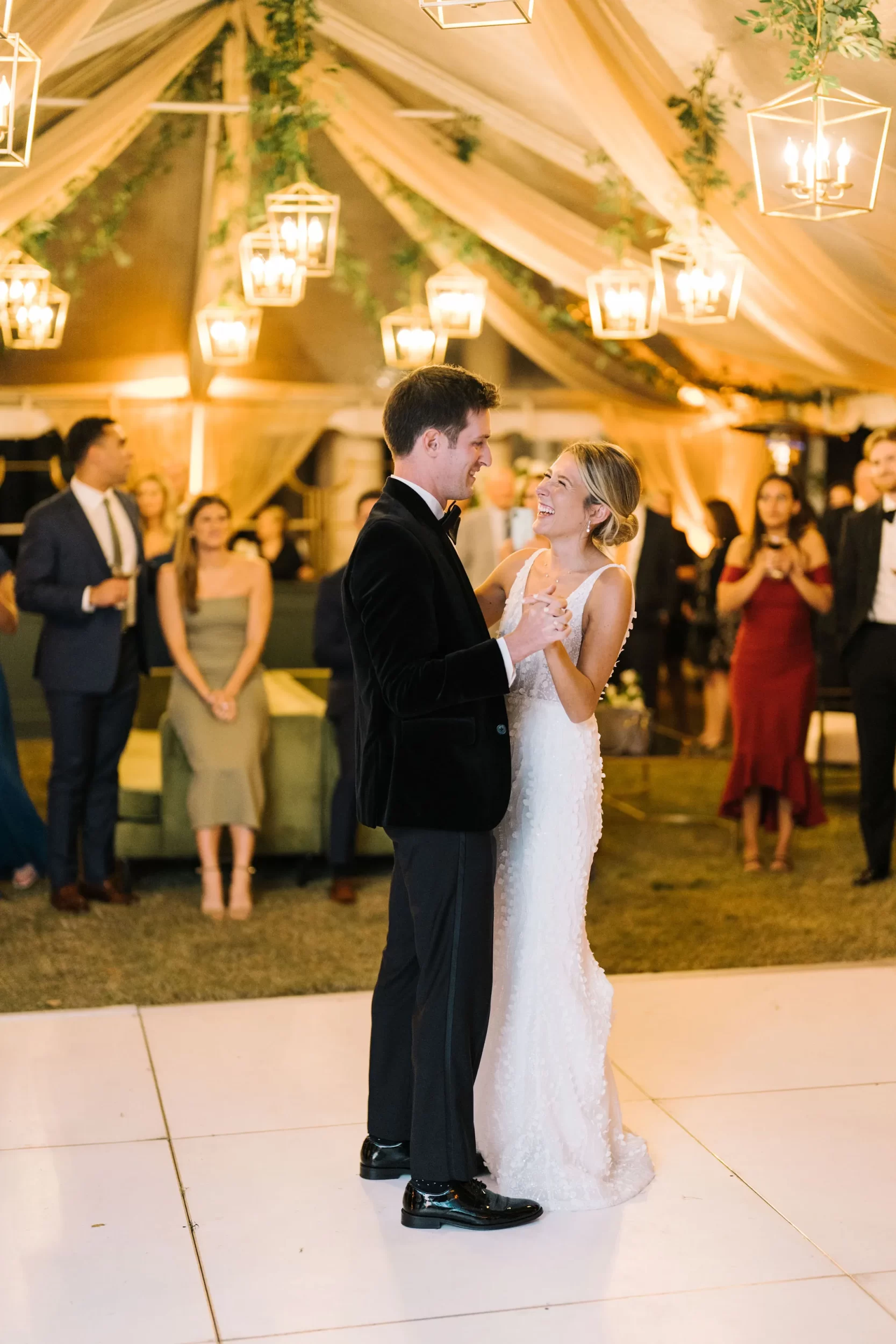 For the reception, guests enjoyed a custom dinner by Kiawah Island Club Catering, a stunning three-tiered cake by Ashley Bakery, and late-night dancing under the stars — complete with cozy green velvet lounge setups from EventWorks and floral covered bars framed by gold lanterns and draped greenery! It was such a gorgeous day!