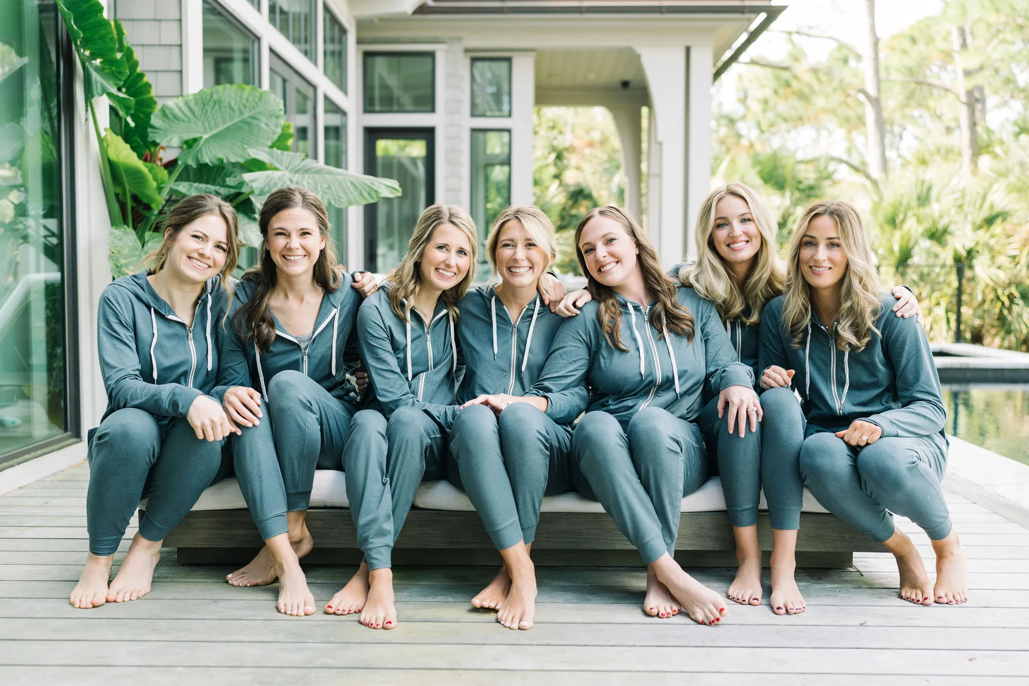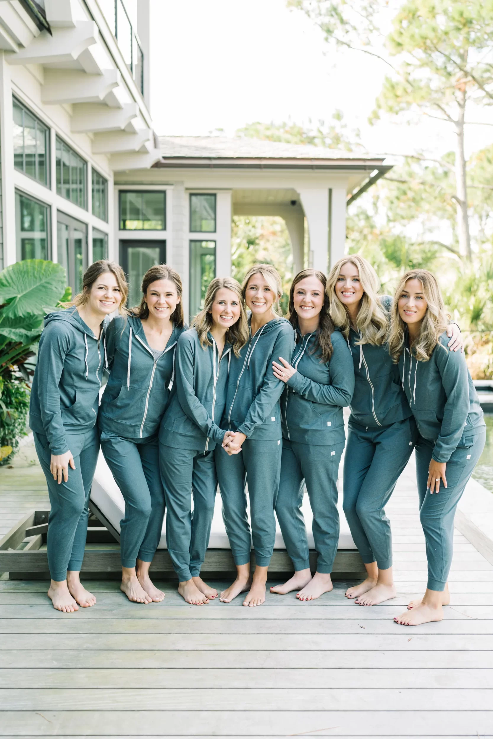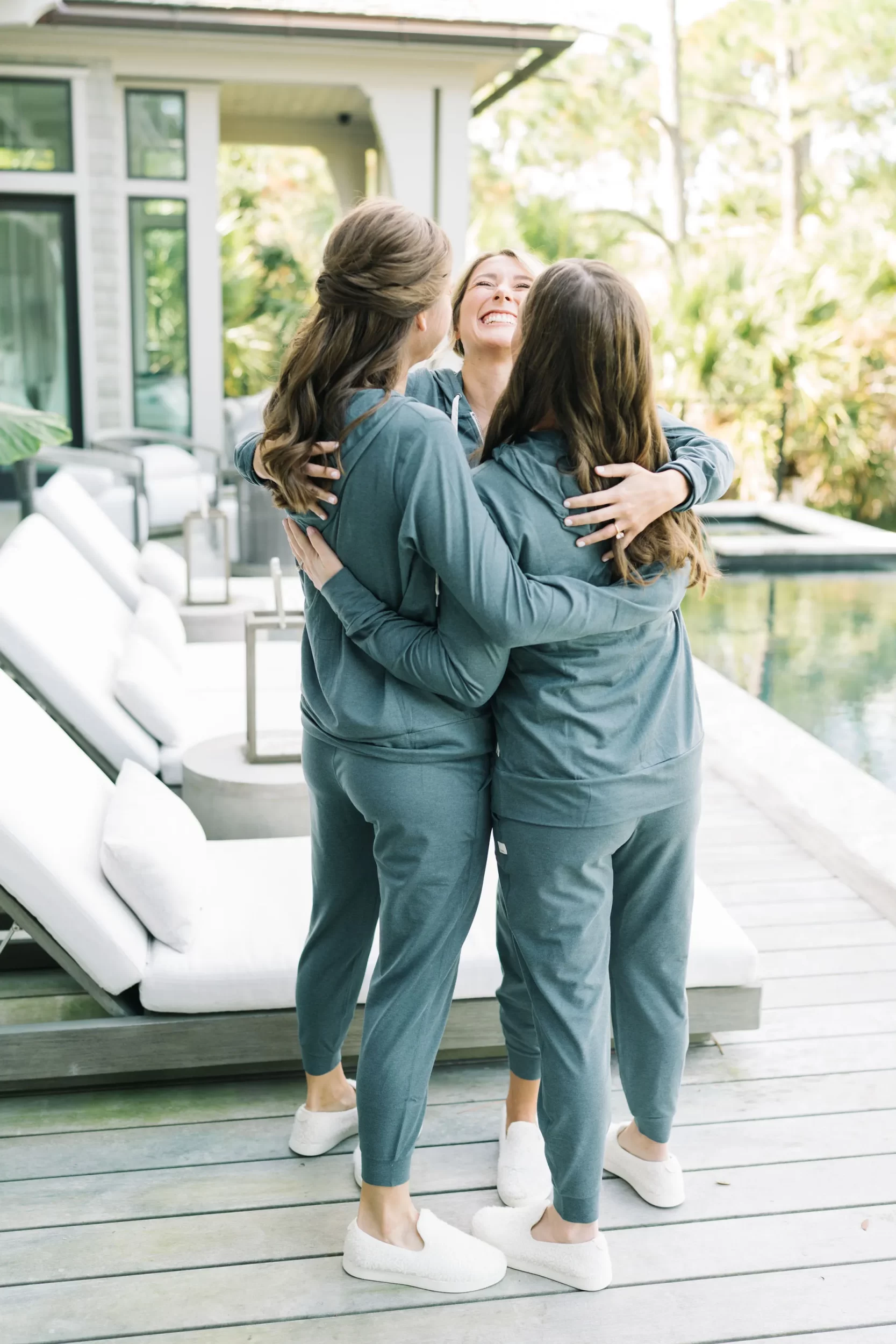 Abby stunned in a modern gown by Jane Hill, found at Alice & Ivory in Chicago. Her look was completed with Dolce Vita heels, soft, romantic makeup by Brianna Adams, and hair styled by Cheryl Quinn. Her bridesmaids wore Atlantic Blue gowns by Dessy, with getting-ready joggers from Vuori that made for the cutest photos out by the pool at Abby’s parents’ house the morning of the wedding!