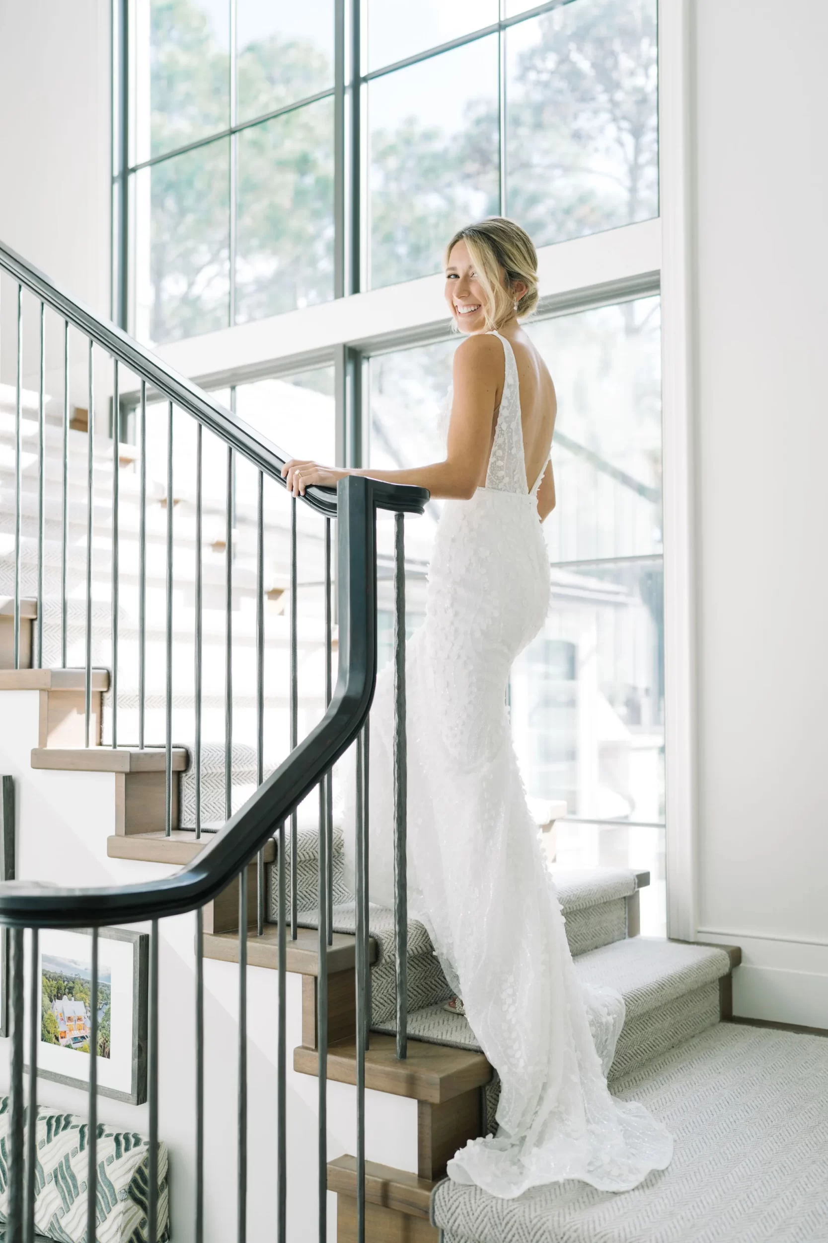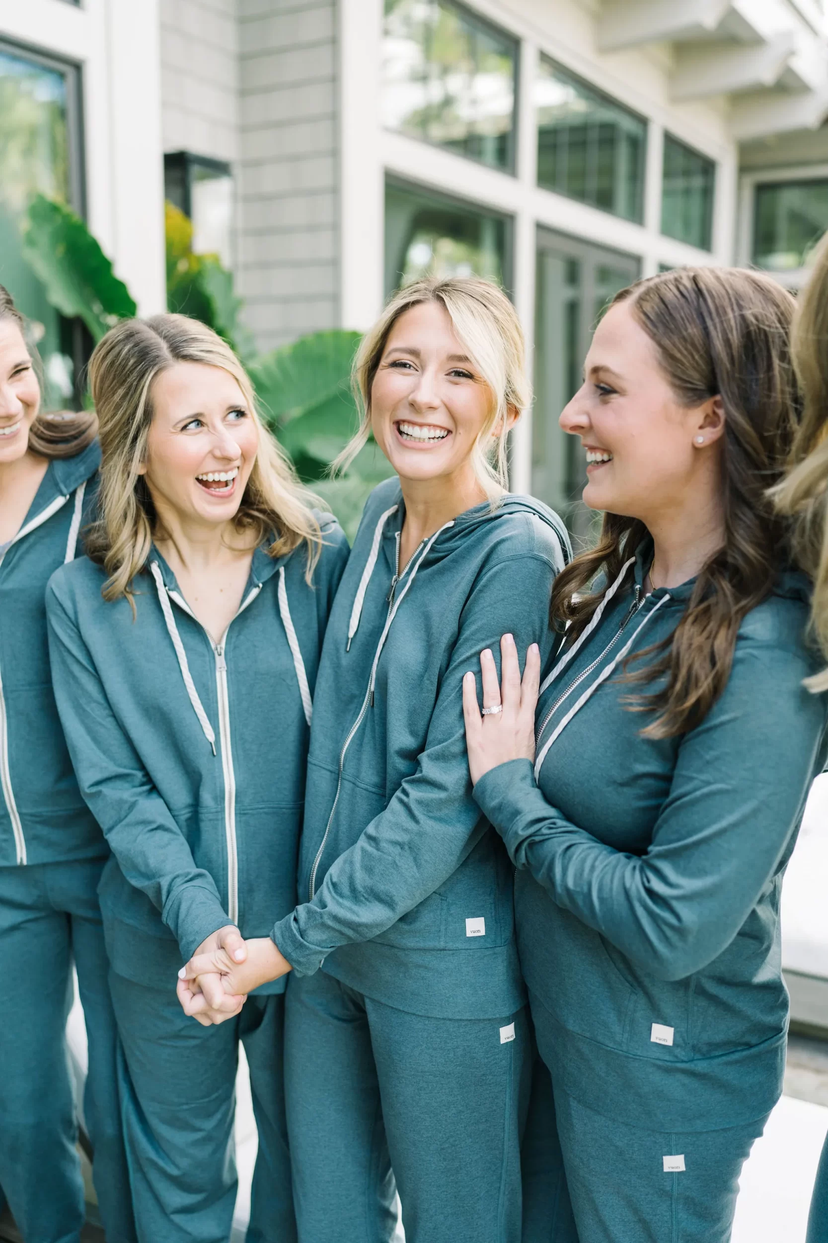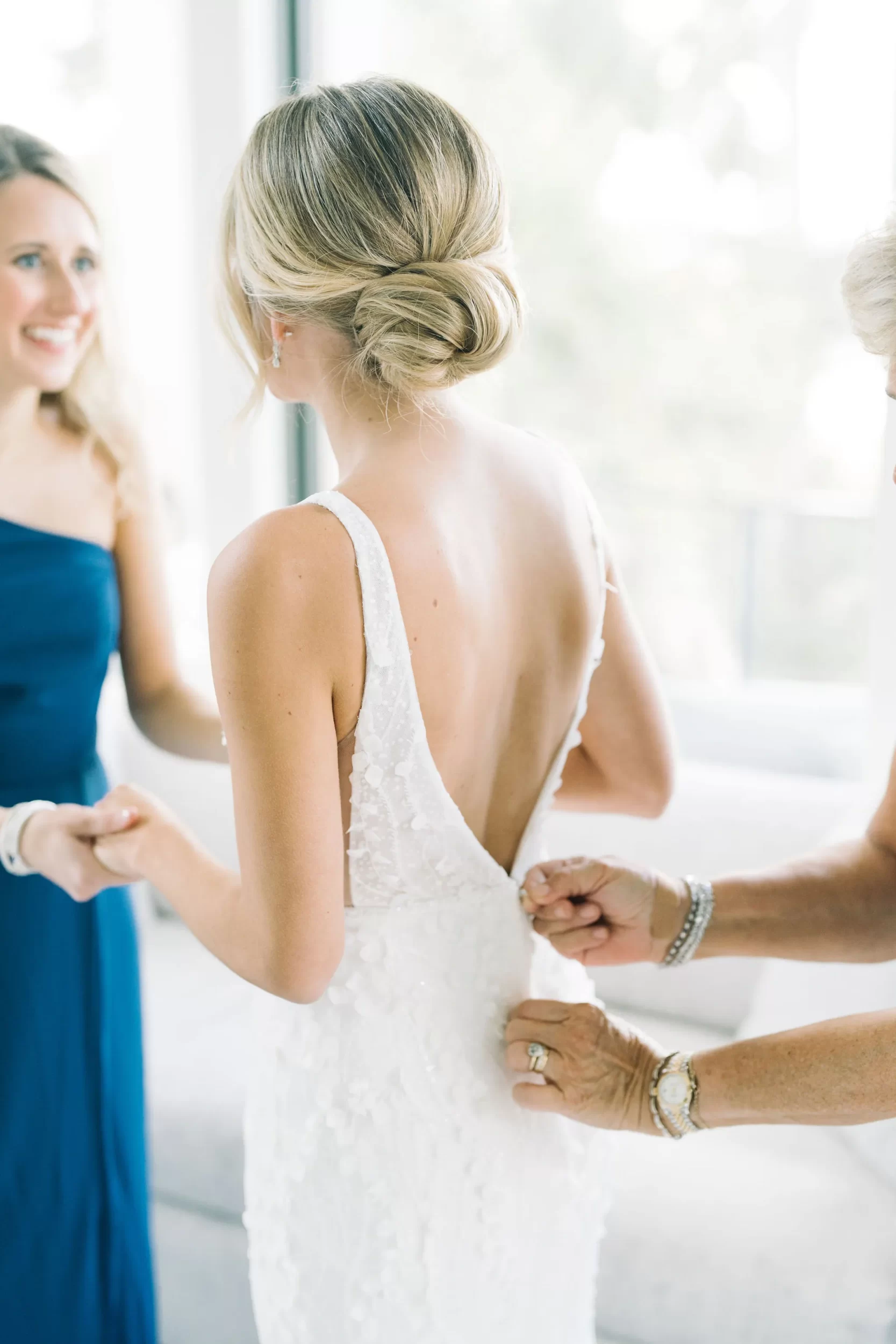 Abby stunned in a modern gown by Jane Hill, found at Alice & Ivory in Chicago. Her look was completed with Dolce Vita heels, soft, romantic makeup by Brianna Adams, and hair styled by Cheryl Quinn. Her bridesmaids wore Atlantic Blue gowns by Dessy, with getting-ready joggers from Vuori that made for the cutest photos out by the pool at Abby’s parents’ house the morning of the wedding!